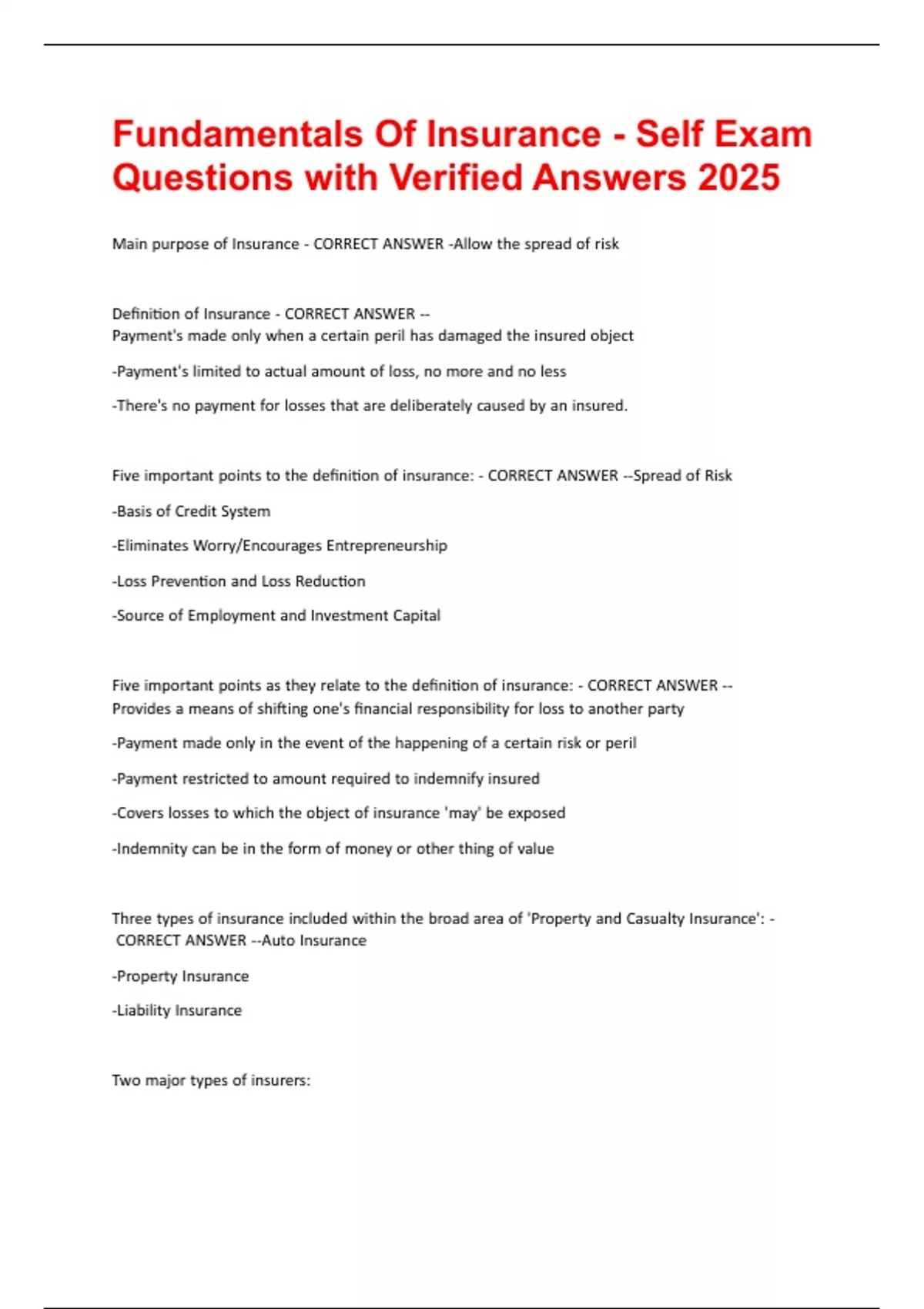 Fundamentals Of Insurance - Self Exam Questions with Verified Answers 2025