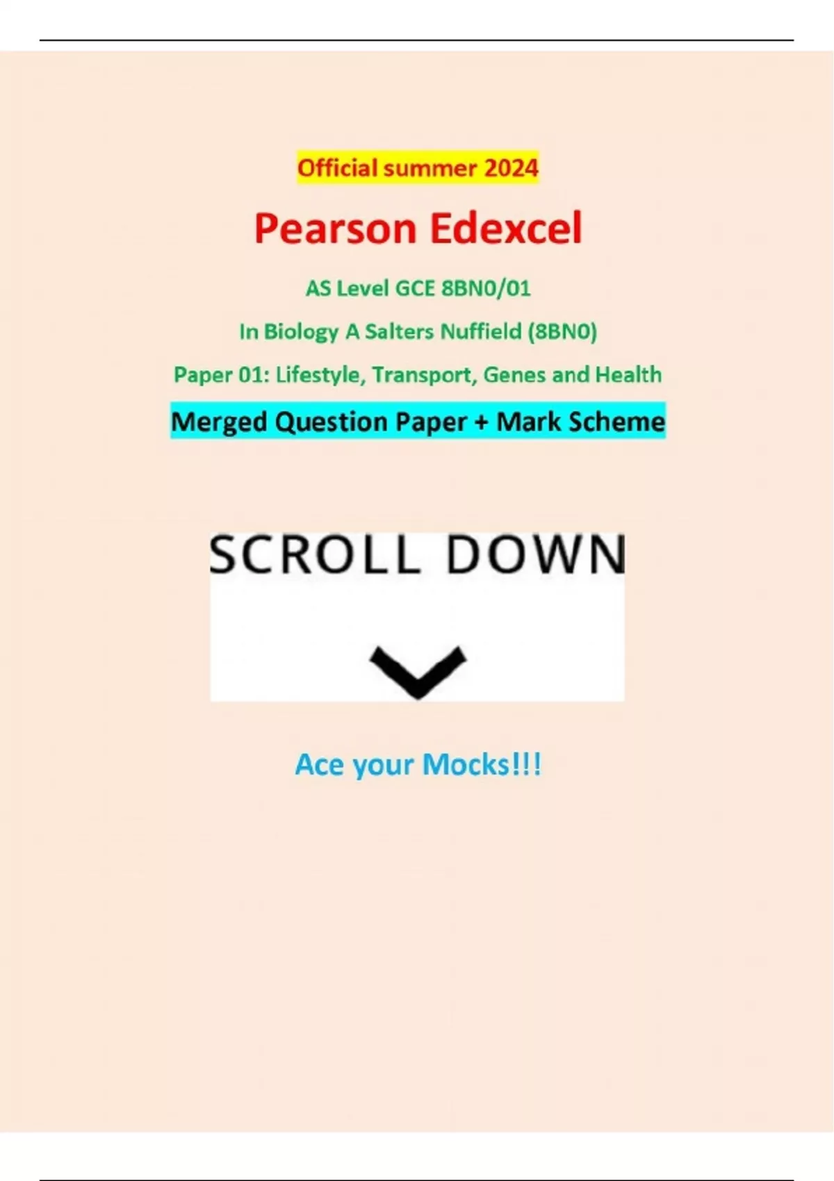 Official summer 2024 Pearson Edexcel AS Level GCE 8BN0/01 In Biology A Salters Nuffield (8BN0) Paper 01: Lifestyle, Transport, Genes and Health Merged Question Paper + Mark Scheme