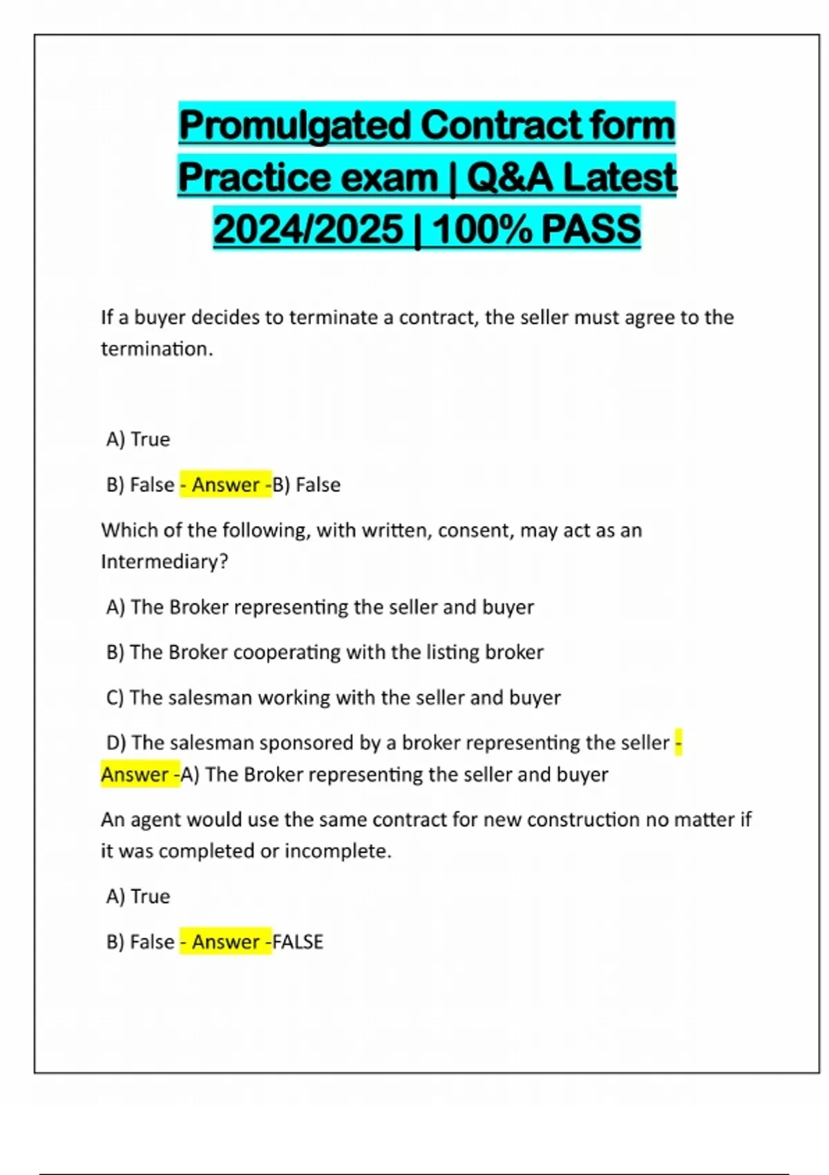 Promulgated Contract form Practice exam | Q&A Latest 2024/2025 | 100% PASS If a buyer decides to terminate a contract, the seller must agree to the termination. A) True B) False - Answer -B) False Which of the following, with written, consent, may act as an Intermediary? A) The Broker representing the seller and buyer B) The Broker cooperating with the listing broker C) The salesman working with the seller and buyer D) The salesman sponsored by a broker representing the seller - Answer -A) The Broker representing the seller and buyer An agent would use the same contract for new construction no matter if it was completed or incomplete. A) True B) False - Answer -FALSERegarding mediation - the Buyer and Seller are obligated under the terms of the Residential contract to abide by the ruling of the mediator. A) True B) False - Answer -B) False A bilateral contract is: A) A promise in exchange for a promi