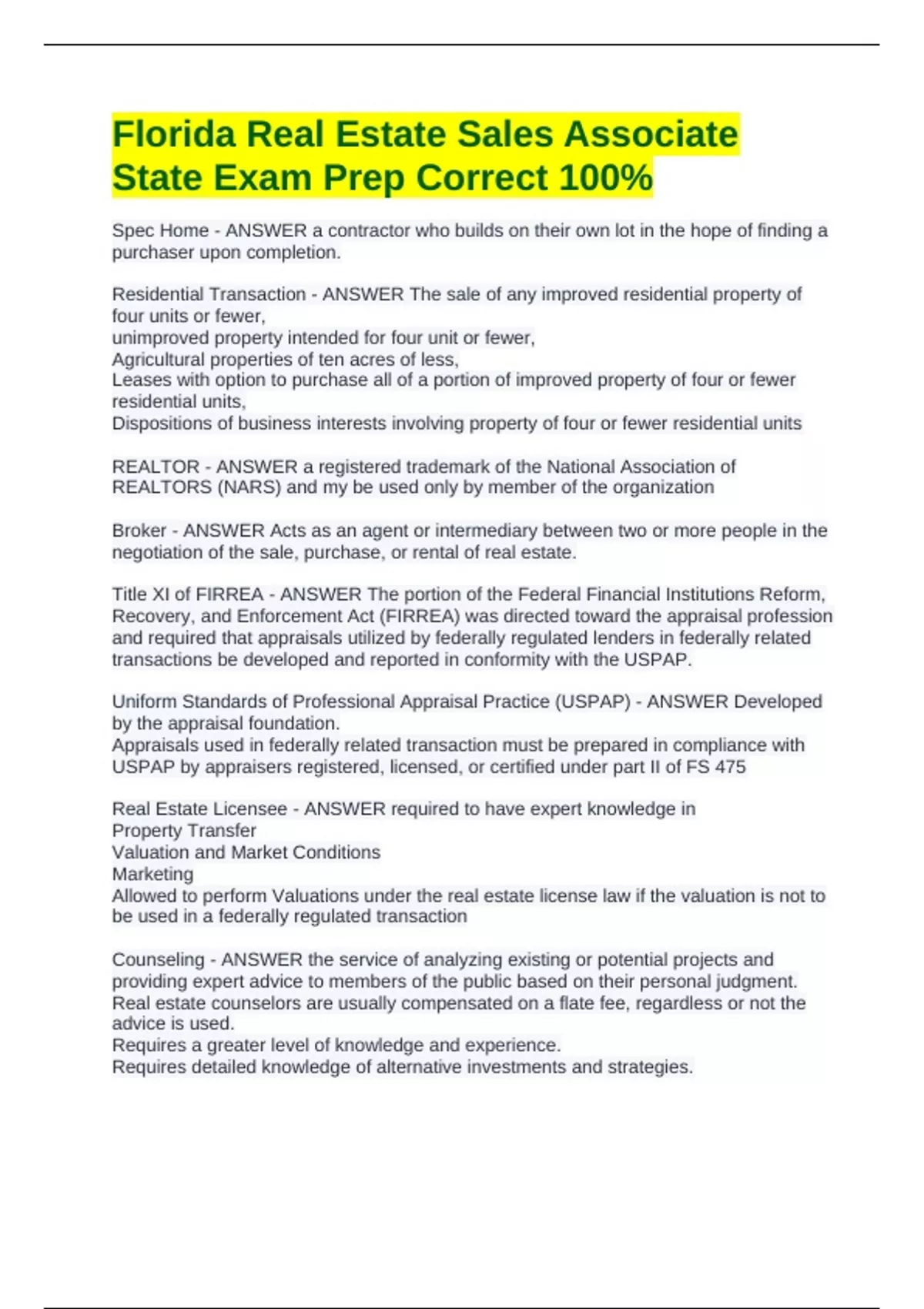 Florida Real Estate Sales Associate State Exam Prep Correct 100%