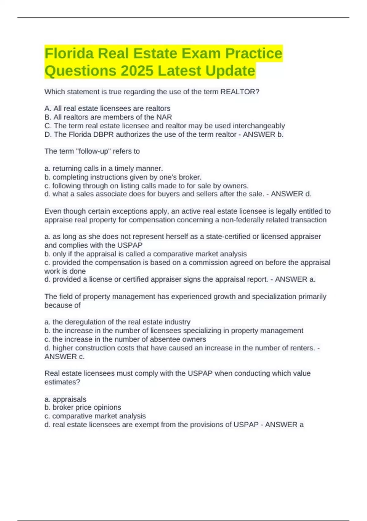 Florida Real Estate Exam Practice Questions 2025 Latest Update