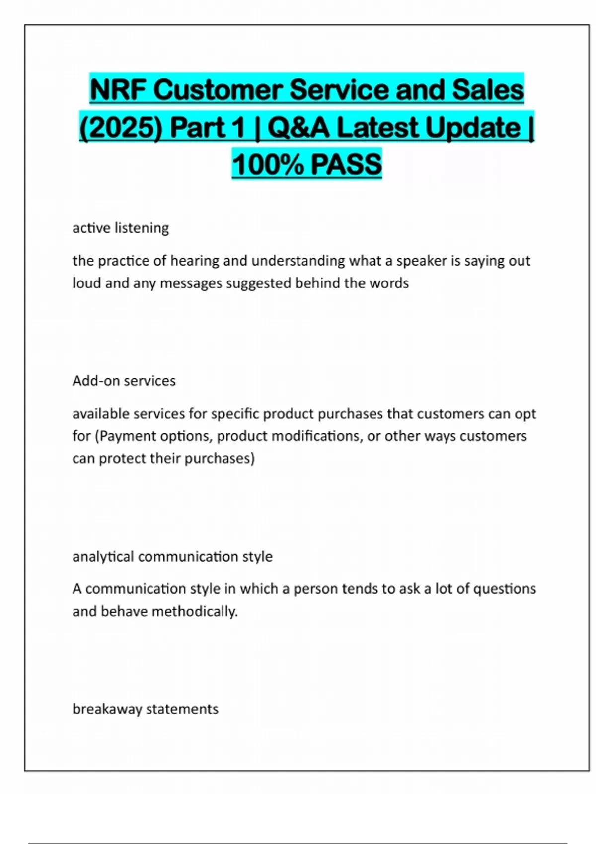 NRF Customer Service and Sales (2025) Part 1 | Q&A Latest Update | 100% PASS active listening the practice of hearing and understanding what a speaker is saying out loud and any messages suggested behind the words Add-on services available services for specific product purchases that customers can opt for (Payment options, product modifications, or other ways customers can protect their purchases) analytical communication style