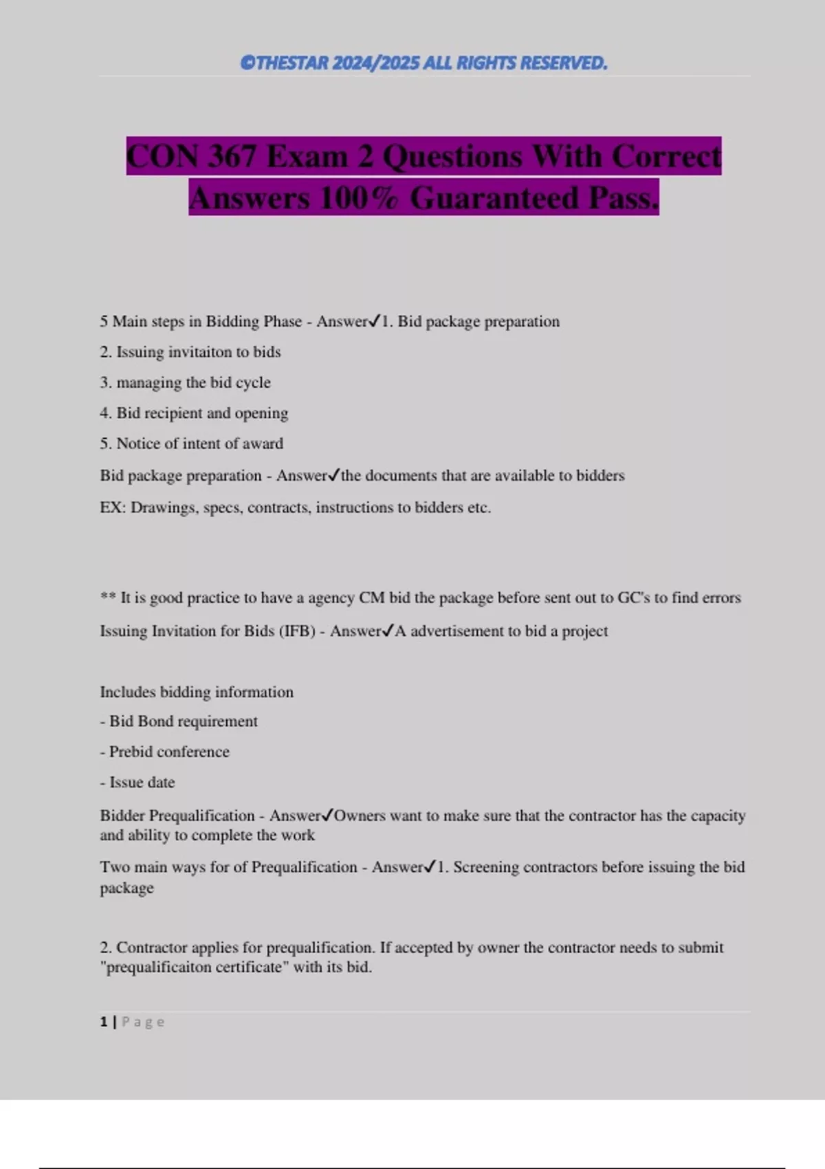 CON 367 Exam 2 Questions With Correct Answers 100% Guaranteed Pass. 5 Main steps in Bidding Phase - Answer1. Bid package preparation 2. Issuing invitaiton to bids 3. managing the bid cycle 4. Bid recipient and opening 5. Notice of intent of award Bid package preparation - Answerthe documents that are available to bidders EX: Drawings, specs, contracts, instructions to bidders etc. ** It is good practice to have a agency CM bid the package before sent out to GC's to find errors Issuing Invitation for Bids (IFB) - AnswerA advertisement to bid a project Includes bidding information - Bid Bond requirement - Prebid conference - Issue date Bidder Prequalification - AnswerOwners want to make sure that the contractor has the capacity and ability to complete the work Two main ways for of Prequalification - Answer1. Screening contractors before issuing the bid package 2. Contractor applies for prequalification. If accepted by owner the contractor needs to submit "prequalificaiton certificate" with its bid. 2 | P a g e Managing the Bid Cycle - AnswerMaking sure that the bid cycle is smooth for contractors. Prebid Conference: Explain technical aspects of the project as well as the supplementary conditions, bidders bring up potential problems such as inadequate bidding time. Site Visits Addenda Bid Receipt and opening - Answerin public projects this is a formal procedure set by regulation The procedure of submitting a bid for careful review Notice of intent to award - AnswerWhoever is awarded the bid. Usually the lowest price, responsible bidder Notice states that the bidder needs to furnish a performance Bonds - AnswerA financial obligation to assure payments will be made. Issued by a surety. Surety company thoroughly analyzes contractor before issuing them a bond. Provides a extra level of financial resource behind the contractor, a place the owner can turn to if the contractor cannot meet contractual agreements through their own assets Penal Sum - AnswerThe limit of a Surety's company liability under a bond. Tripartite relationship - AnswerPrincipal: Contractor Obligor : Surety Obligee: owner Bid Bond - AnswerThe obligation states that the principal will honor its bid. Performance Bond - Answerthe obligation stat