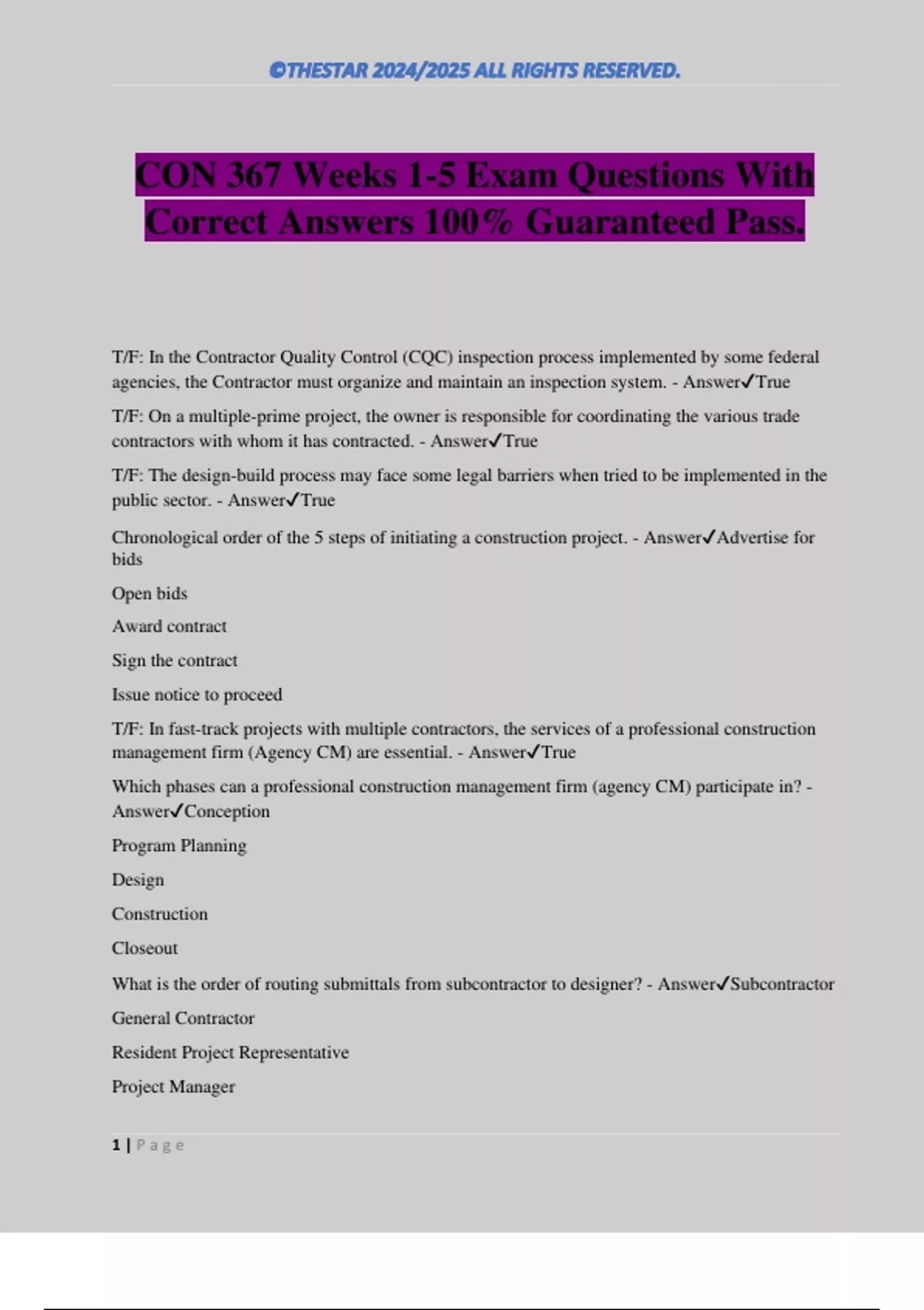 CON 367 Weeks 1-5 Exam Questions With Correct Answers 100% Guaranteed Pass. T/F: In the Contractor Quality Control (CQC) inspection process implemented by some federal agencies, the Contractor must organize and maintain an inspection system. - AnswerTrue T/F: On a multiple-prime project, the owner is responsible for coordinating the various trade contractors with whom it has contracted. - AnswerTrue T/F: The design-build process may face some legal barriers when tried to be implemented in the public sector. - AnswerTrue Chronological order of the 5 steps of initiating a construction project. - AnswerAdvertise for bids Open bids Award contract Sign the contract Issue notice to proceed T/F: In fast-track projects with multiple contractors, the services of a professional construction management firm (Agency CM) are essential. - AnswerTrue Which phases can a professional construction management firm (agency CM) participate in? - AnswerConception Program Planning Design Construction Closeout What is the order of routing submittals from subcontractor to designer? - AnswerSubcontractor General Contractor Resident Project Representati
