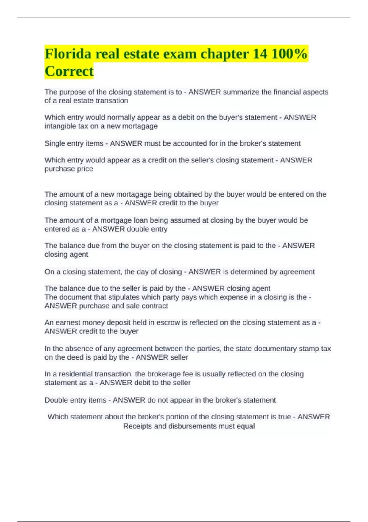 Which statement about the broker's portion of the closing statement is true - ANSWER