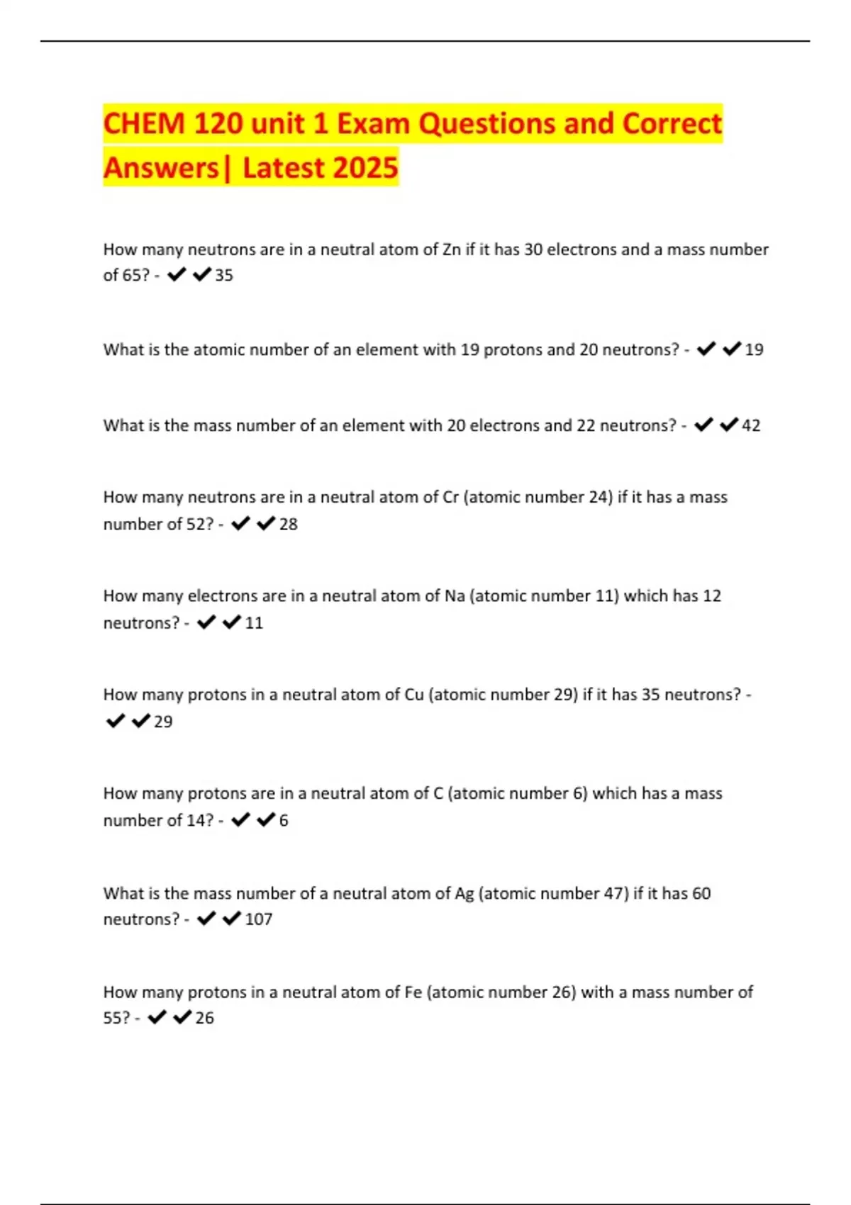 CHEM 120 unit 1 Exam Questions and Correct