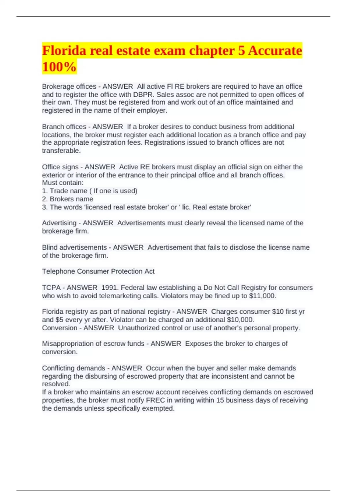 Florida real estate exam chapter 5 Accurate