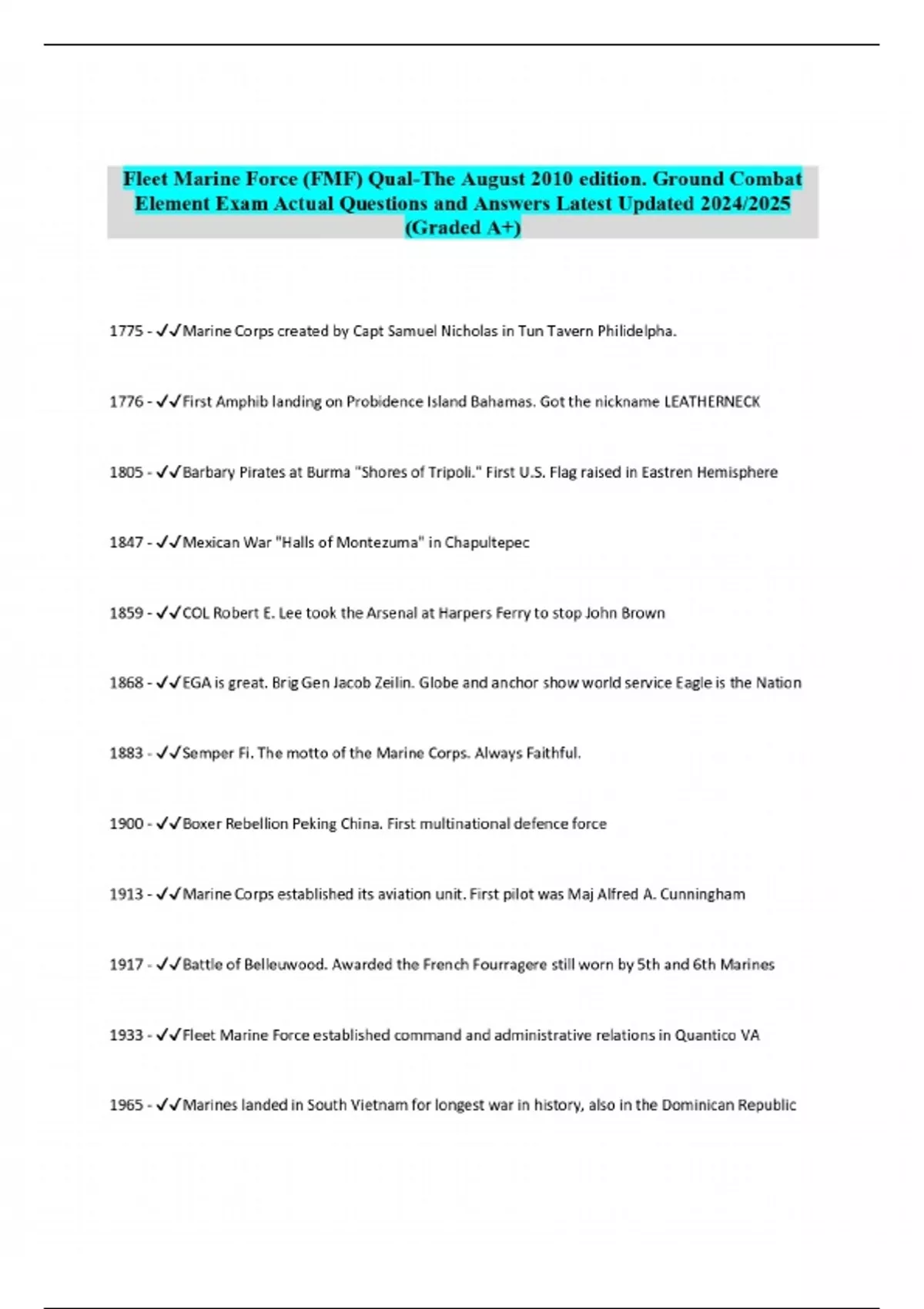 Fleet Marine Force (FMF) Qual-The August 2010 edition. Ground Combat Element Exam Actual Questions and Answers