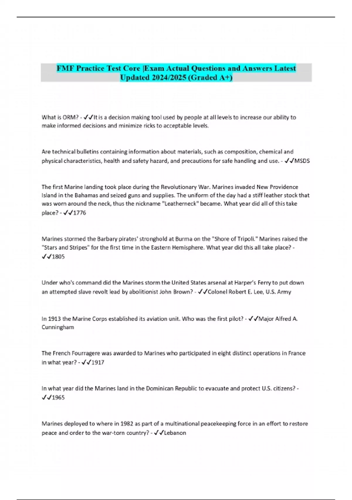 FMF Practice Test Core |Exam Actual Questions and Answers