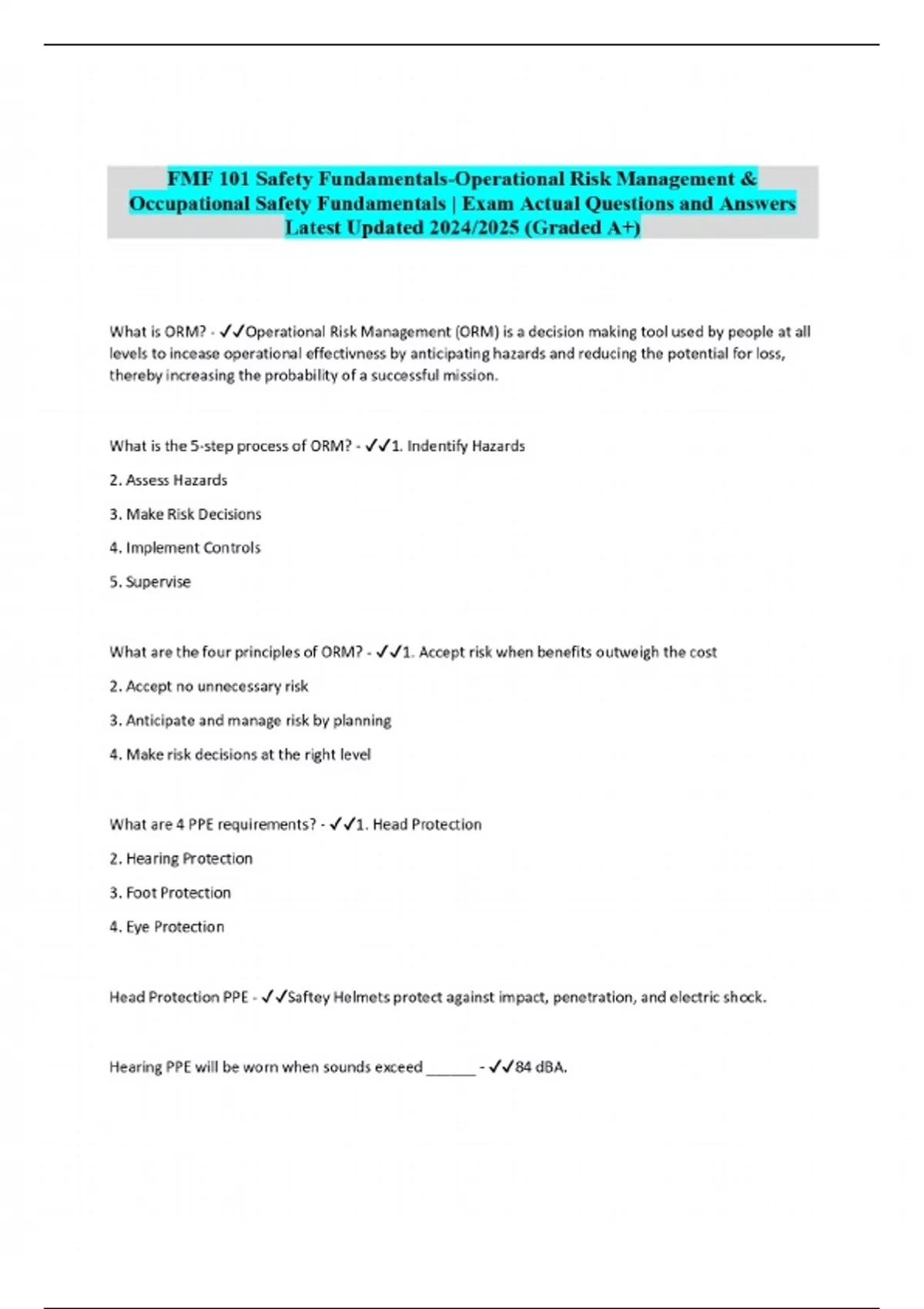 FMF 101 Safety Fundamentals-Operational Risk Management & Occupational Safety Fundamentals | Exam Actual Questions and Answers