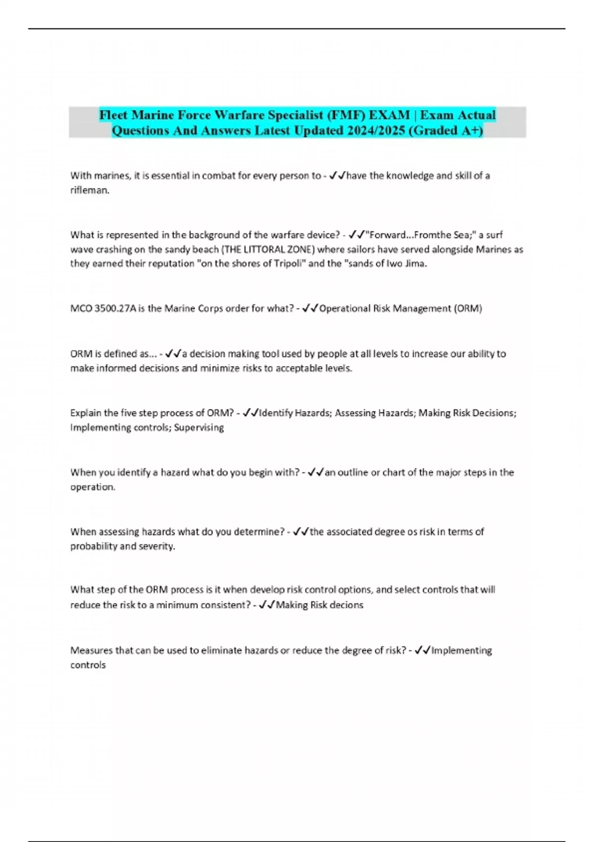 Fleet Marine Force Warfare Specialist (FMF) EXAM | Exam Actual Questions And Answers