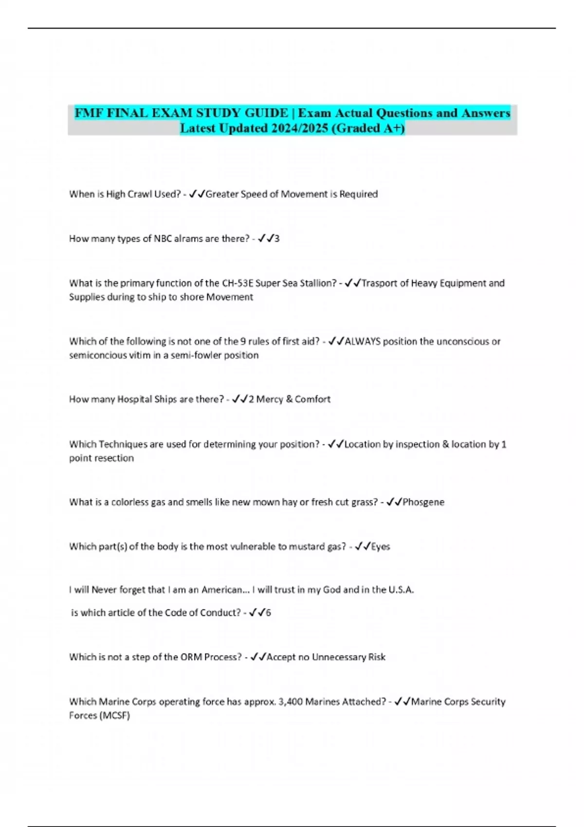 FMF FINAL EXAM STUDY GUIDE | Exam Actual Questions and Answers