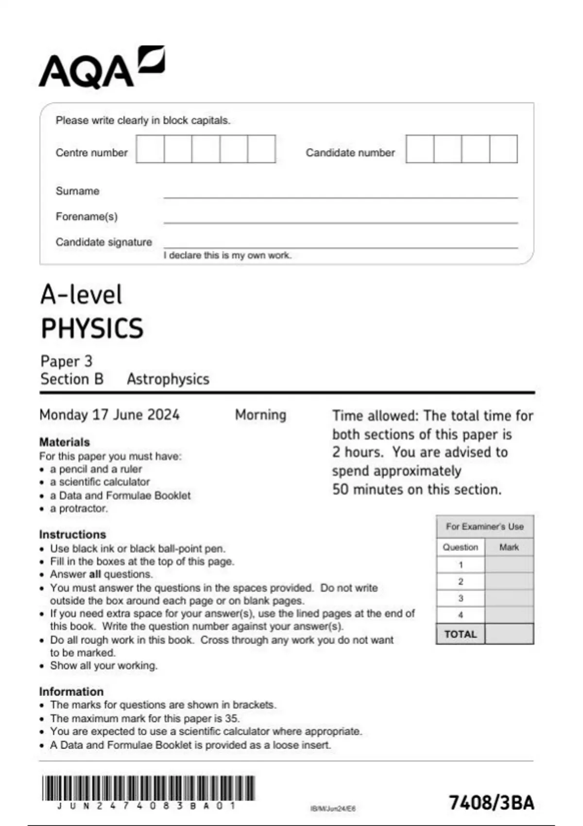 AQA A LEVEL PHYSICS PAPER 3BA JUNE 2024 FINAL QUESTION PAPER