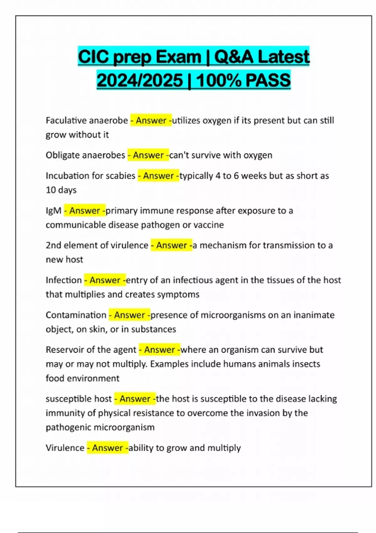 CIC prep Exam | Q&A Latest 2024/2025 | 100% PASS Faculative anaerobe - Answer -utilizes oxygen if its present but can still grow without it Obligate anaerobes - Answer -can't survive with oxygen Incubation for scabies - Answer -typically 4 to 6 weeks but as short as 10 days IgM - Answer -primary immune response after exposure to a communicable disease pathogen or vaccine 2nd element of virulence - Answer -a mechanism for transmission to a new host Infection - Answer -entry of an infectious agent in the tissues of the host that multiplies and creates symptoms Contamination - Answer -presence of microorganisms on an inanimate object, on skin, or in substances Reservoir of the agent - Answer -where an organism can survive but may or may not multiply. Examples include humans animals insects food environment susceptible host - Answer -the host is susceptible to the disease lacking immunity of physical resistance to overcome the invasion by the pathogenic microorganism Virulence - Answer -ability to grow and