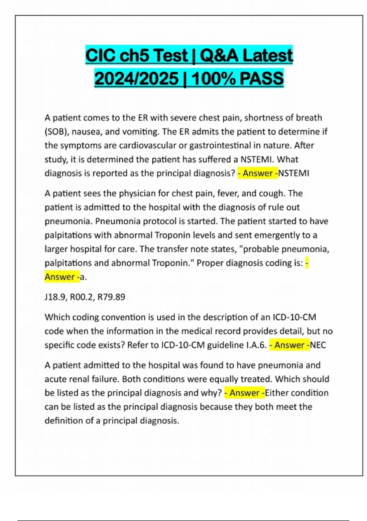 CIC ch5 Test | Q&A Latest 2024/2025 | 100% PASS A patient comes to the ER with severe chest pain, shortness of breath (SOB), nausea, and vomiting. The ER admits the patient to determine if the symptoms are cardiovascular or gastrointestinal in nature. After study, it is determined the patient has suffered a NSTEMI. What diagnosis is reported as the principal diagnosis? - Answer -NSTEMI A patient sees the physician for chest pain, fever, and cough. The patient is admitted to the hospital with the diagnosis of rule out pneumonia. Pneumonia protocol is started. The patient started to have palpitations with abnormal Troponin levels and sent emergently to a larger hospital for care. The transfer note states, "probable pneumonia, palpitations and abnormal Troponin." Proper diagnosis coding is: - Answer -a. J18.9, R00.2, R79.89 Which coding convention is used in the description of an ICD-10-CM code when the information in the medical record provides detail, but no specific code exists? Refer to ICD-10-CM guideline I.A.6. - Answer -NEC A patient admitted to the hospital was found to have pneumonia and acute renal failure. Both conditions were equally treated. Which should be listed as the principal diagnosis and why? - Answer -Either condition can be listed as the principal diagn