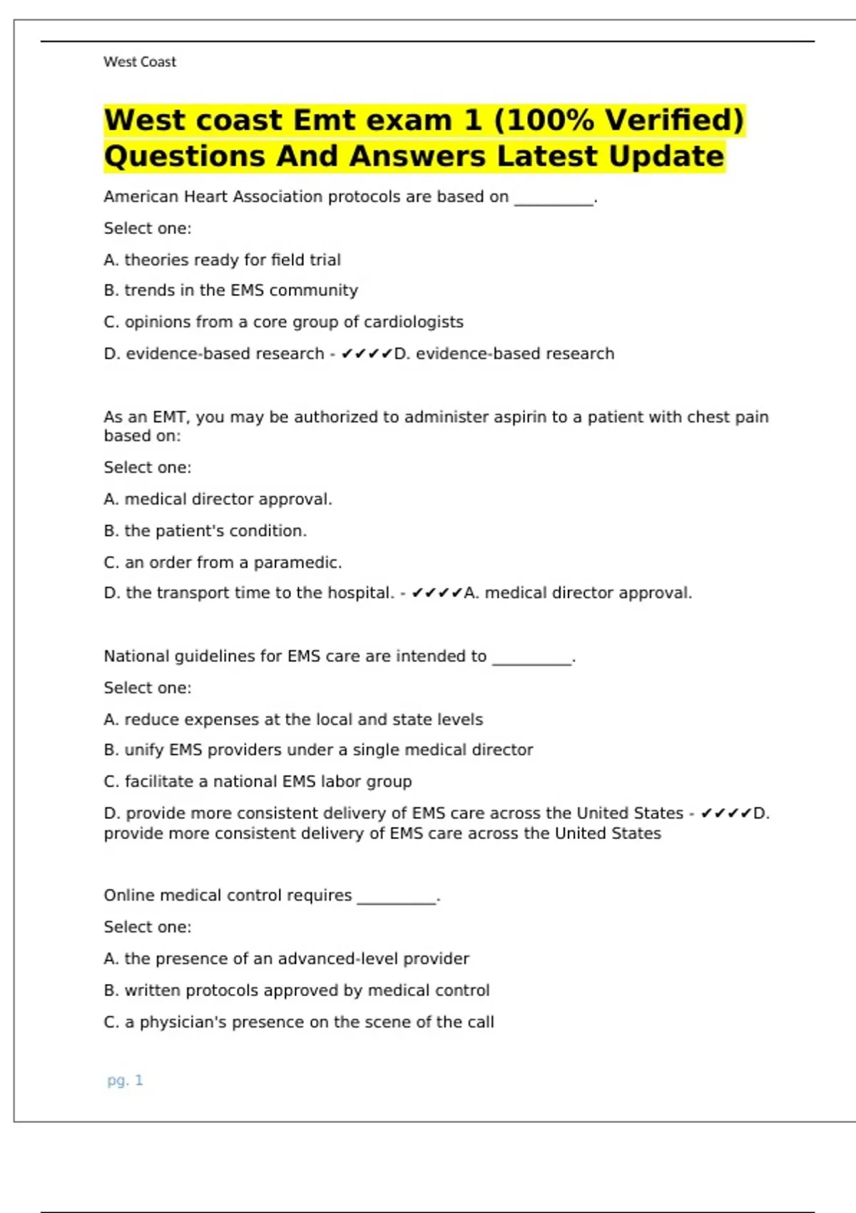 West coast Emt exam 1 (100% Verified) Questions And Answers Latest Update