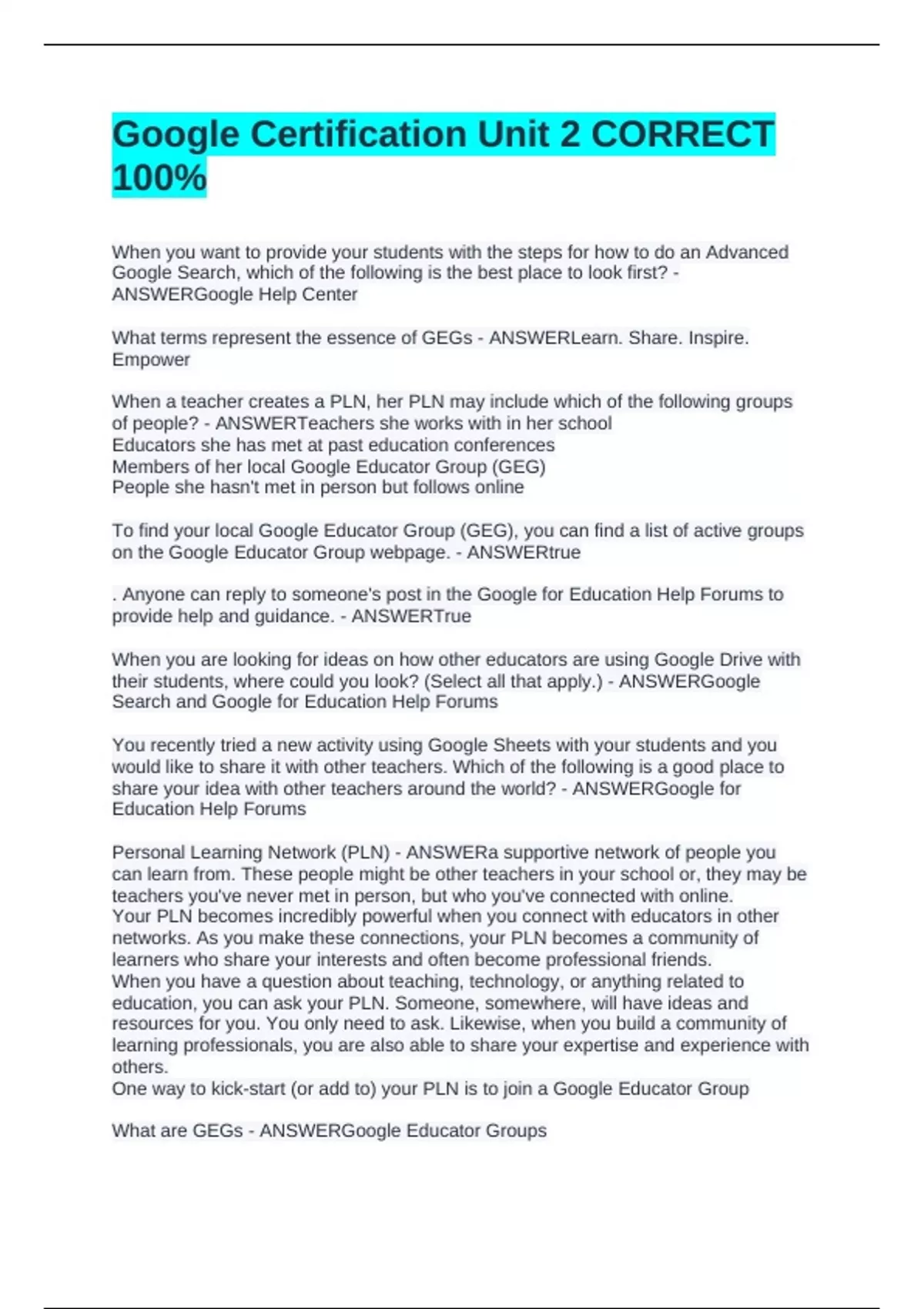 When you want to provide your students with the steps for how to do an Advanced Google Search, which of the following is the best place to look first? - ANSWERGoogle Help Center What terms represent the essence of GEGs - ANSWERLearn. Share. Inspire. Empower When a teacher creates a PLN, her PLN may include which of the following groups of people? - ANSWERTeachers she works with in her school Educators she has met at past education conferences Members of her local Google Educator Group (GEG) People she hasn't met in person but follows online To find your local Google Educator Group (GEG), you can find a list of active groups on the Google Educator Group webpage. - ANSWERtrue . Anyone can reply to someone's post in the Google for Education Help Forums to provide help and guidance. - ANSWERTrue When you are looking for ideas on how other educators are using Google Drive with their students, where could you look? (Select all that apply.) - ANSWERGoogle Search and Google for Education Help Forums You recently tried a new activity using Google Sheets with your students and you would like to share it with other teachers. Which of the following is a good place to share your idea with other teachers around the world? - ANSWERGoogle for Education Help Forums