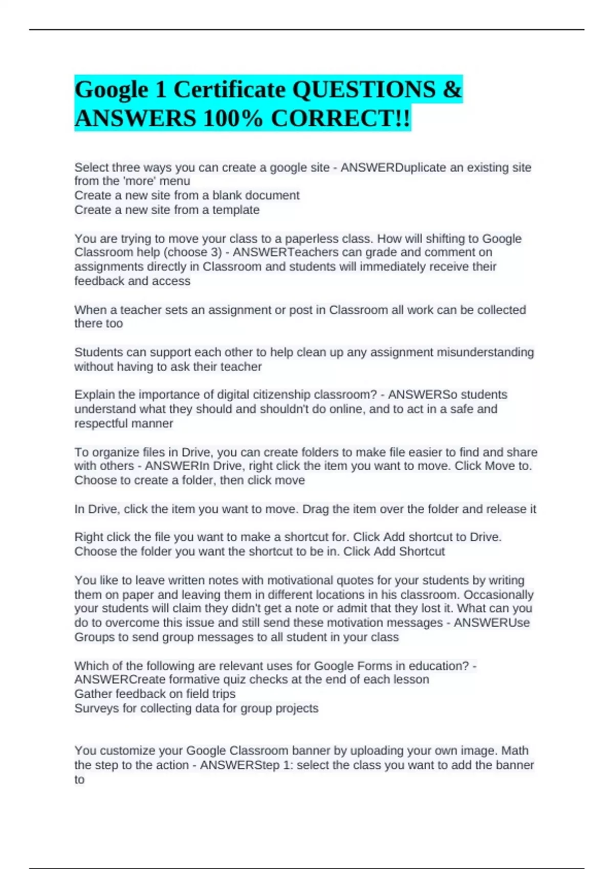 Google 1 Certificate QUESTIONS & ANSWERS 100% CORRECT!!