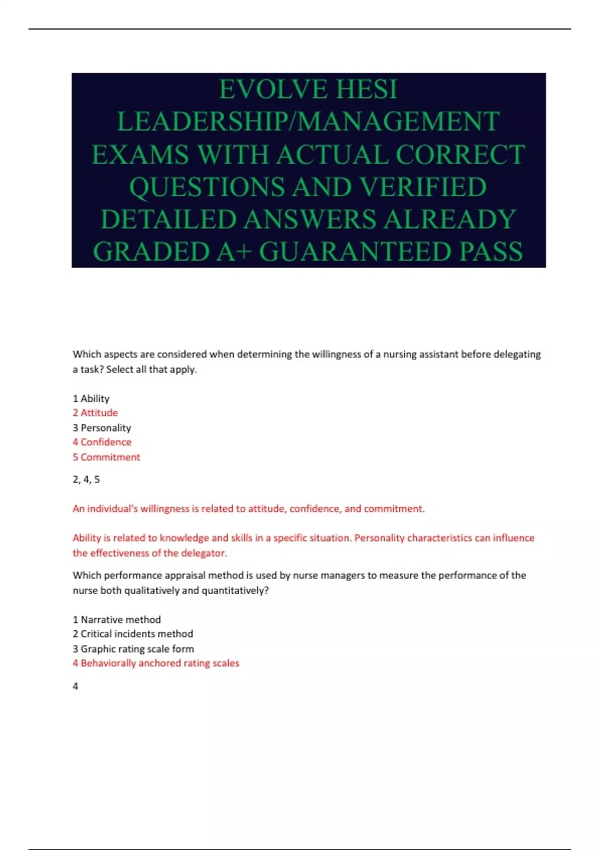 EVOLVE HESI LEADERSHIP/MANAGEMENT EXAMS WITH ACTUAL CORRECT QUESTIONS AND VERIFIED DETAILED ANSWERS ALREADY GRADED A+ GUARANTEED PASS