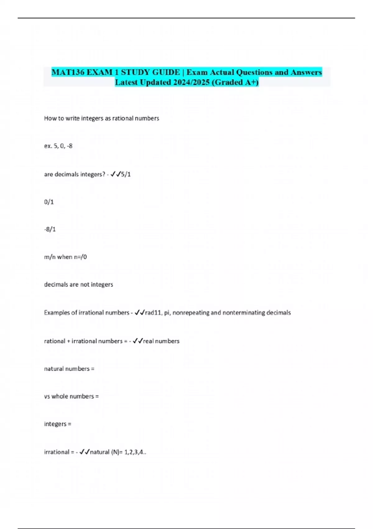 MAT136 EXAM 1 STUDY GUIDE | Exam Actual Questions and Answers