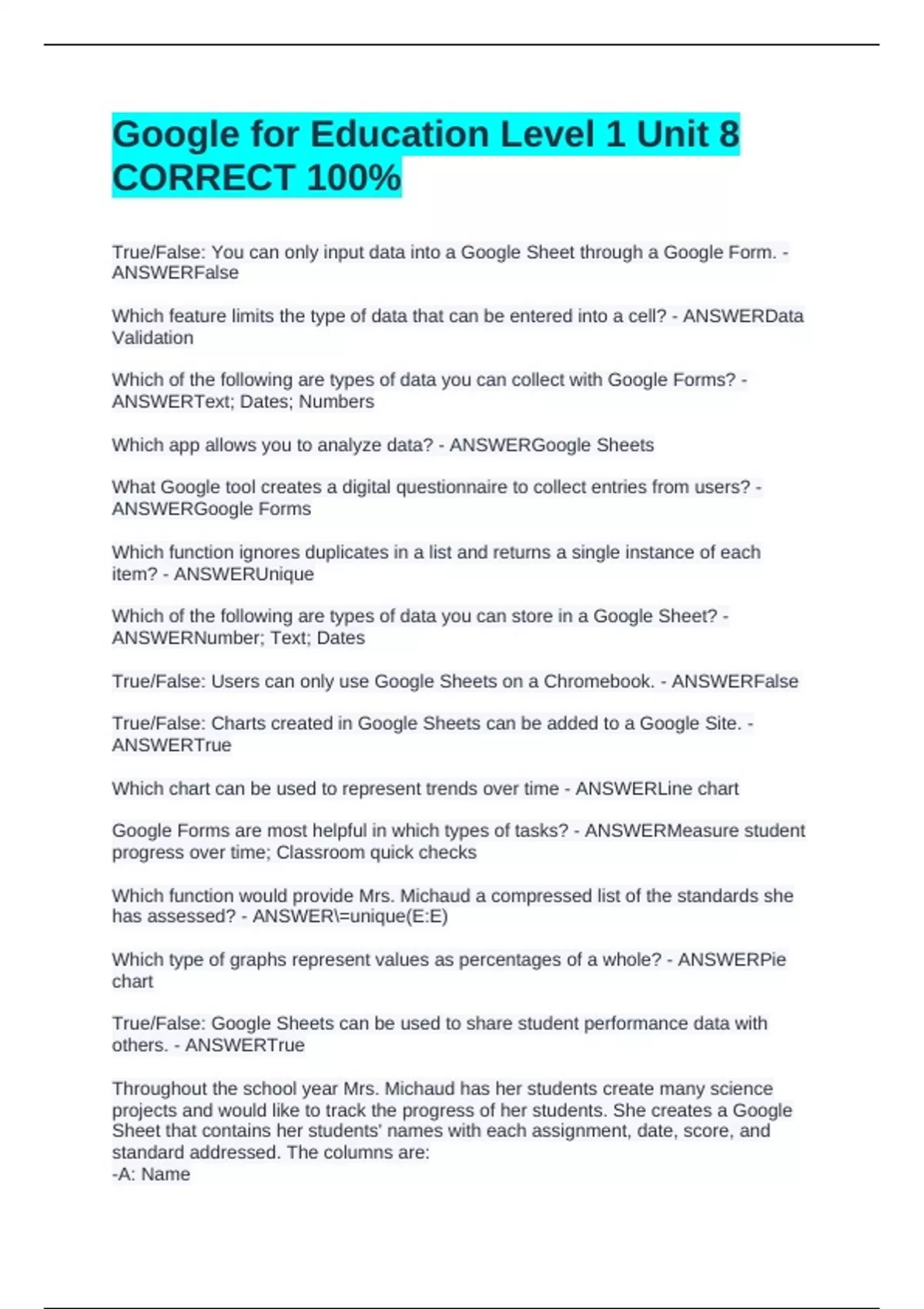 True/False: Google Sheets can be used to share student performance data with
