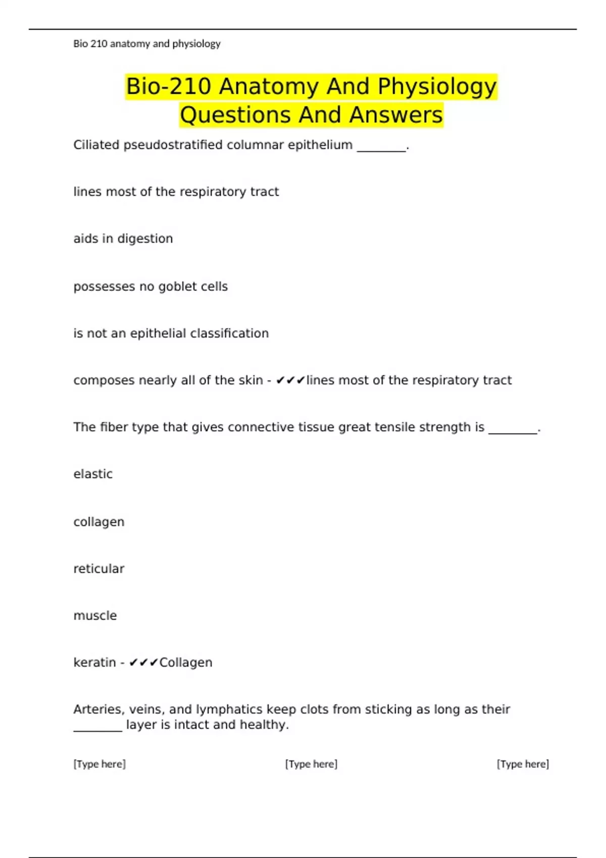 Bio-210 Anatomy And Physiology Questions And Answers