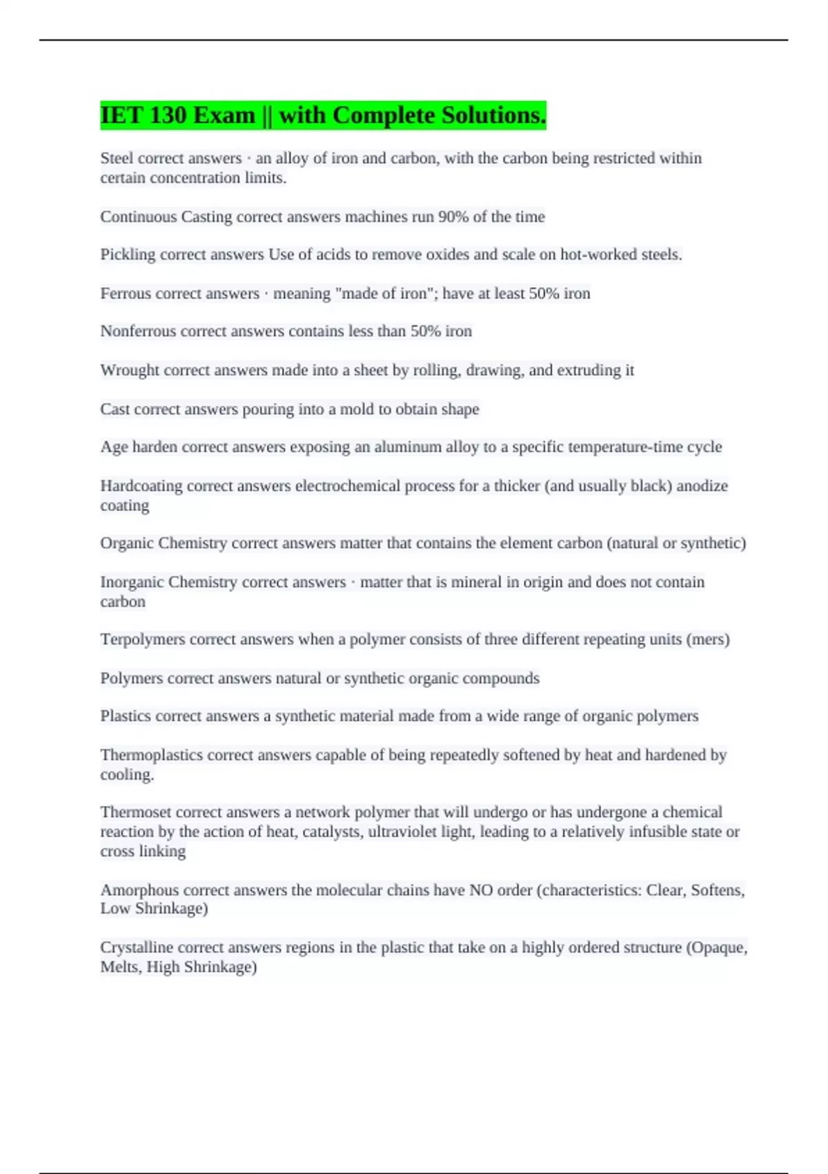 Steel correct answers · an alloy of iron and carbon, with the carbon being restricted within certain concentration limits. Continuous Casting correct answers machines run 90% of the time Pickling correct answers Use of acids to remove oxides and scale on hot-worked steels. Ferrous correct answers · meaning "made of iron"; have at least 50% iron Nonferrous correct answers contains less than 50% iron Wrought correct answers made into a sheet by rolling, drawing, and extruding it Cast correct answers pouring into a mold to obtain shape Age harden correct answers exposing an aluminum alloy to a specific temperature-time cycle Hardcoating correct answers electrochemical process for a thicker (and usually black) anodize coating Organic Chemistry correct answers matter that contains the element carbon (natural or synthetic) Inorganic Chemistry correct answers · matter that is mineral in origin and does not contain carbon Terpolymers correct answers when a polymer consists of three different repeating units (mers) Polymers correct answers natural or synthetic organic compounds Plastics correct answers a synthetic material made from a wide range of organic polymers Thermoplastics correct answers capable of being repeatedly softened by heat and hardened by cooling. Thermoset correct answers a network polymer that will undergo or has undergone a chemical reaction by the action of heat, catalysts, ultraviolet light, leading to a relatively infusible state or cross linking Amorphous correct answers the molecular chains have NO order (characteristics: Clear, Softens, Low Shrinkage) Crystalline correct answers regions in the plastic that take on a highly ordered structure (Opaque, Melts, High Shrinkage)