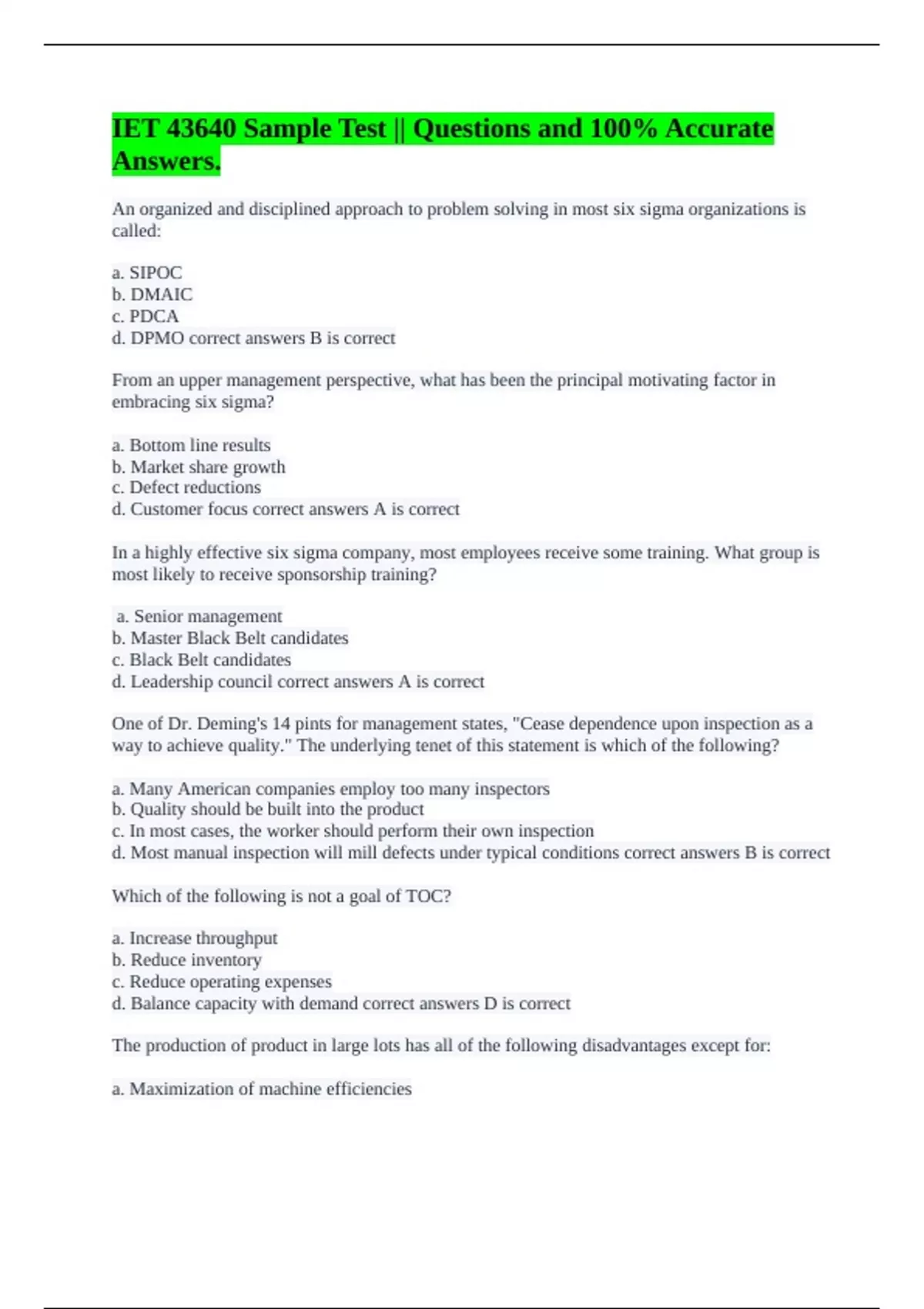 An organized and disciplined approach to problem solving in most six sigma organizations is called: a. SIPOC b. DMAIC c. PDCA d. DPMO correct answers B is correct From an upper management perspective, what has been the principal motivating factor in embracing six sigma? a. Bottom line results b. Market share growth c. Defect reductions d. Customer focus correct answers A is correct In a highly effective six sigma company, most employees receive some training. What group is most likely to receive sponsorship training? a. Senior management b. Master Black Belt candidates c. Black Belt candidates d. Leadership council correct answers A is correct One of Dr. Deming's 14 pints for management states, "Cease dependence upon inspection as a way to achieve quality." The underlying tenet of this statement is which of the following? a. Many American companies employ too many inspectors b. Quality should be built into the product c. In most cases, the worker should perform their own inspection d. Most manual inspection will mill defects under typical conditions correct answers B is correct Which of the following is not a goal of TOC? a. Increase throughput b. Reduce inventory c. Reduce operating expenses d. Balance capacity with demand correct answers D is correct The production of product in large lots has all of the following disadvantages except for: a. Maximization of machine efficiencies