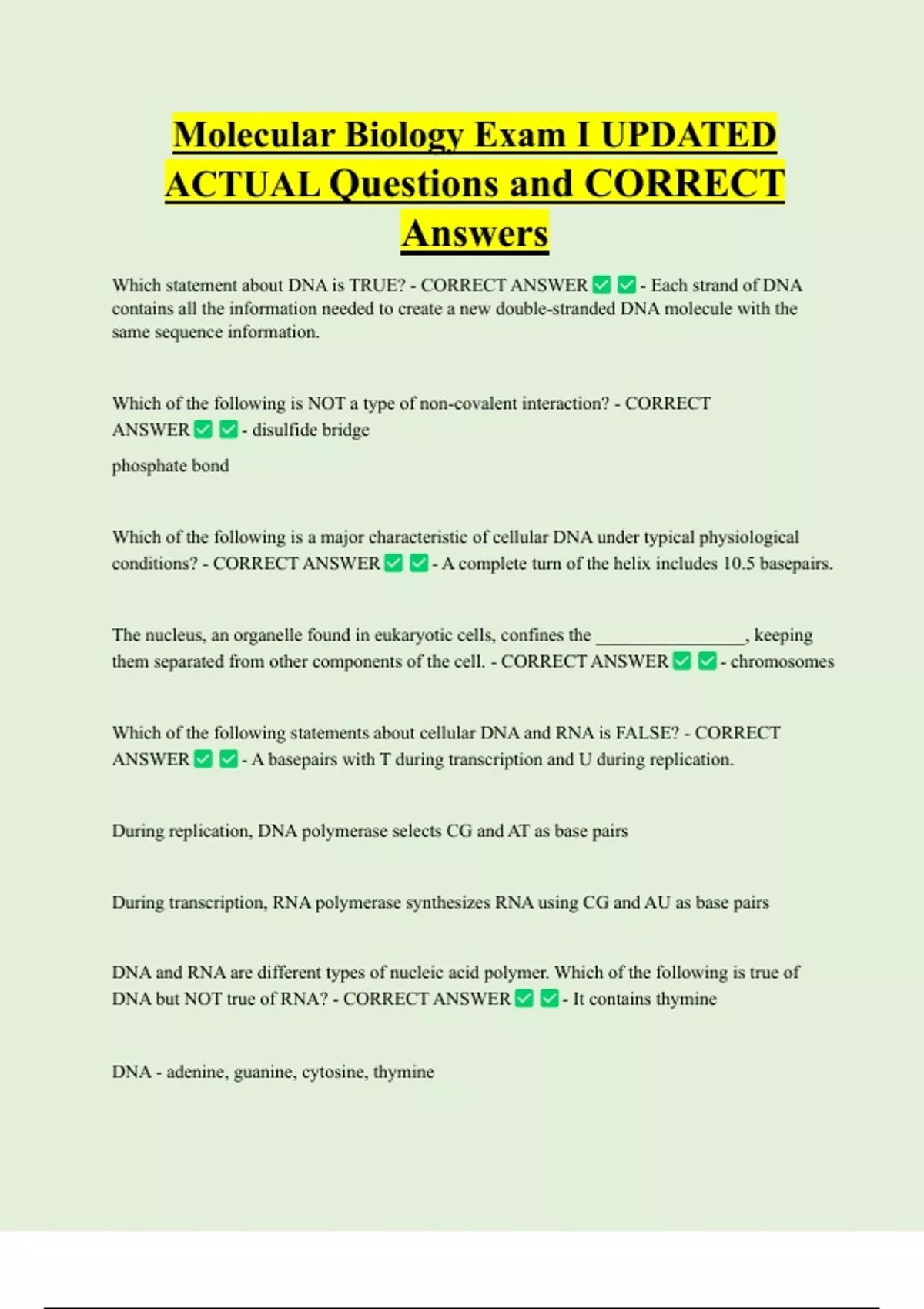 Which statement about DNA is TRUE? - CORRECT ANSWER - Each strand of DNA