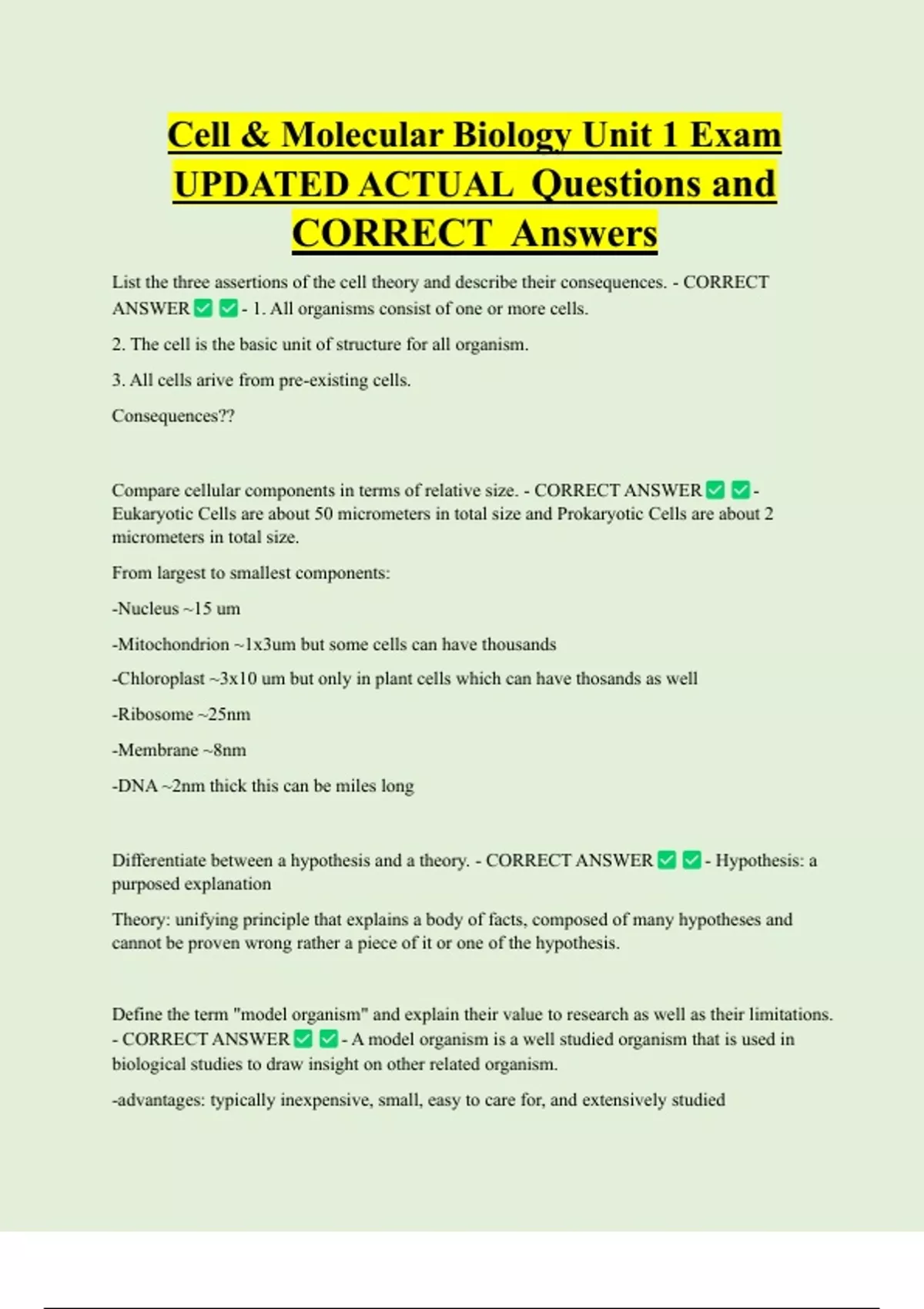 Cell & Molecular Biology Unit 1 Exam UPDATED ACTUAL Questions and CORRECT Answers List the three assertions of the cell theory and describe their consequences. - CORRECT ANSWER - 1. All organisms consist of one or more cells. 2. The cell is the basic unit of structure for all organism. 3. All cells arive from pre-existing cells. Consequences?
