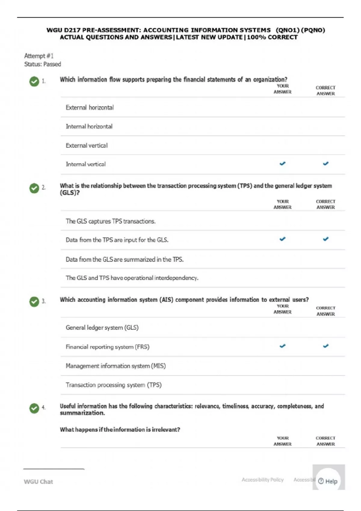 WGU D217 PRE-ASSESSMENT: ACCOUNTING INFORMATION SYSTEMS (QNO1) (PQNO) ACTUAL QUESTIONS AND ANSWERS|LATEST NEW UPDATE|100% CORRECT