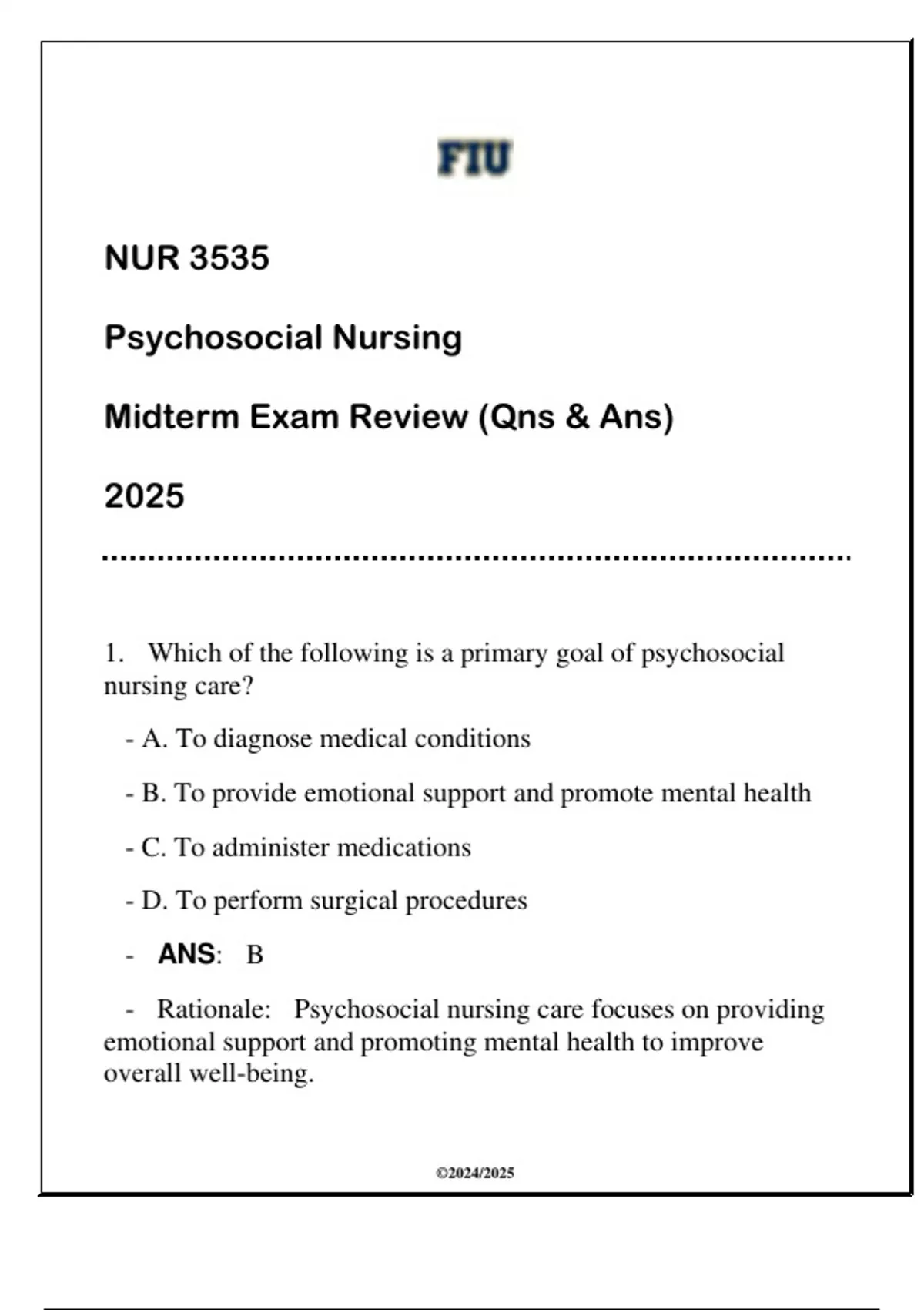 - Rationale: Psychosocial nursing care focuses on providing