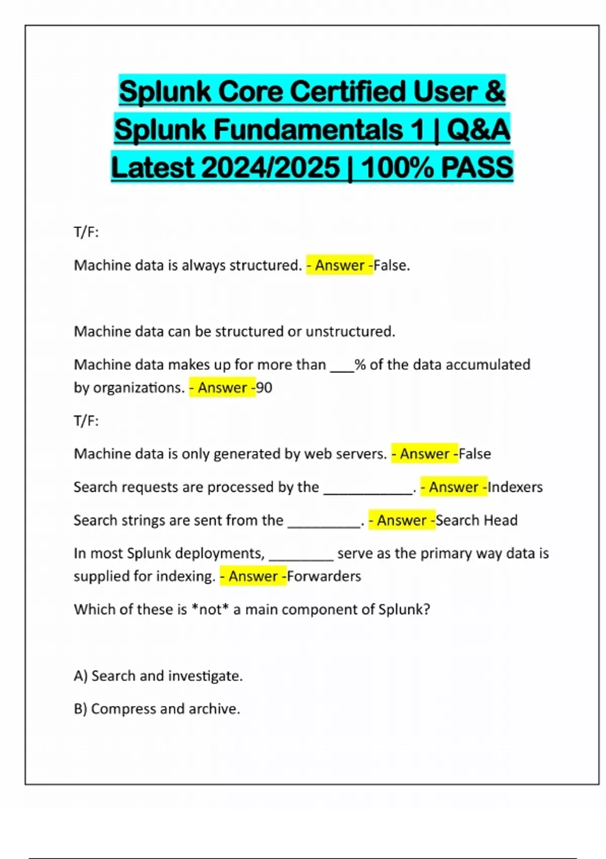 Splunk Core Certified User & Splunk Fundamentals 1 | Q&A Latest 2024/2025 | 100% PASS T/F: Machine data is always structured. - Answer -False. Machine data can be structured or unstructured. Machine data makes up for more than ___% of the data accumulated by organizations. - Answer -90 T/F: Machine data is only generated by web servers. - Answer -False Search requests are processed by the ___________. - Answer -Indexers Search strings are sent from the _________. - Answer -Search Head In most Splunk deployments, ________ serve as the primary way data is supplied for indexing. - Answer -Forwarders Which of these is *not* a main component of Splunk? A) Search and investigate. B) Compress and archive.C) Add knowledge. D) Collect and index data. - Answer -B) Compress and archive What are the three main processing components of Splunk? *(Select all that apply.)* A) Indexers B) Deployment Mak