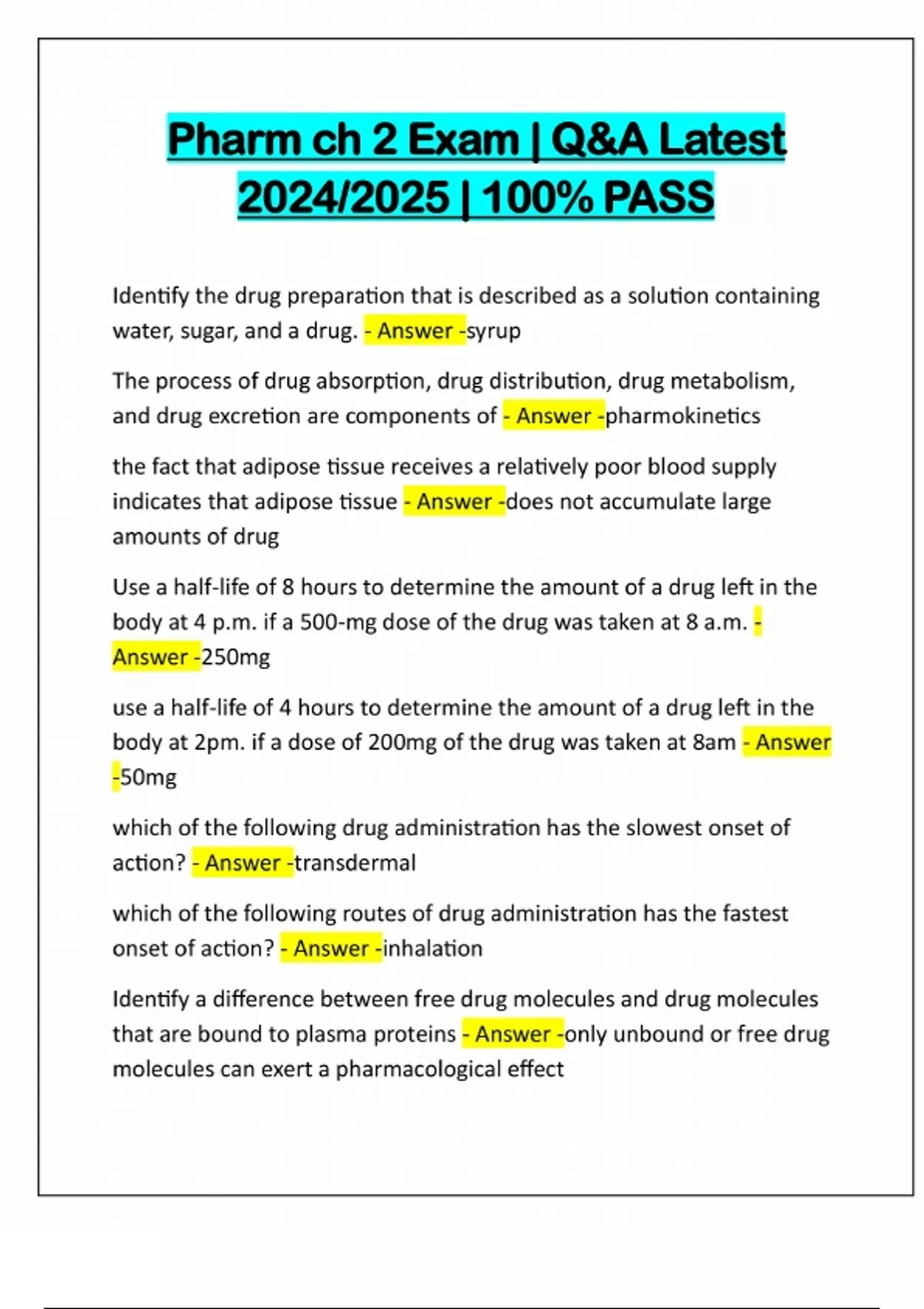 Pharm ch 2 Exam | Q&A Latest 2024/2025 | 100% PASS Identify the drug preparation that is described as a solution containing water, sugar, and a drug. - Answer -syrup The process of drug absorption, drug distribution, drug metabolism, and drug excretion are components of - Answer -pharmokinetics the fact that adipose tissue receives a relatively poor blood supply indicates that adipose tissue - Answer -does not accumulate large amounts of drug Use a half-life of 8 hours to determine the amount of a drug left in the body at 4 p.m. if a 500-mg dose of the drug was taken at 8 a.m. - Answer -250mg