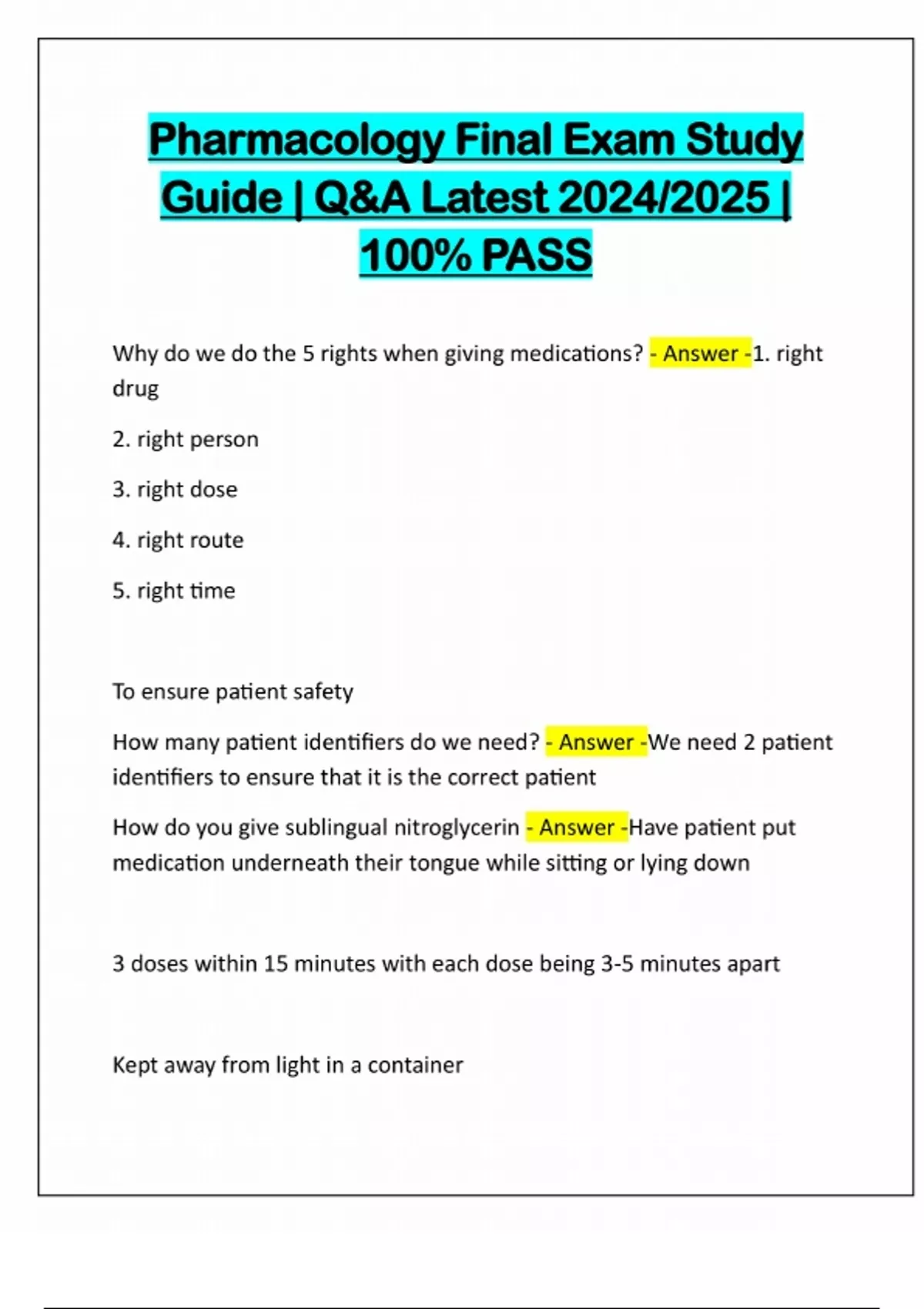 Pharmacology Final Exam Study Guide | Q&A Latest 2024/2025 | 100% PASS Why do we do the 5 rights when giving medications? - Answer -1. right drug 2. right person 3. right dose 4. right route 5. right time To ensure patient safety How many patient identifiers do we need? - Answer -We need 2 patient identifiers to ensure that it is the correct patient How do you give sublingual nitroglycerin - Answer -Have patient put medication underneath their tongue while sitting or lying down 3 doses within 15 minutes with each dose being 3-5 minutes apart Kept away from light in a containerSystolic must remain above 90 Benefit of giving a transdermal patch? - Answer -Gives the medication a constant level, where the levels in the body do not fluctuate as much Trough levels - Answer -Lowest plasma concentration of a drug and it measures the rate at which the drug is eliminated from the body Rate of elimination