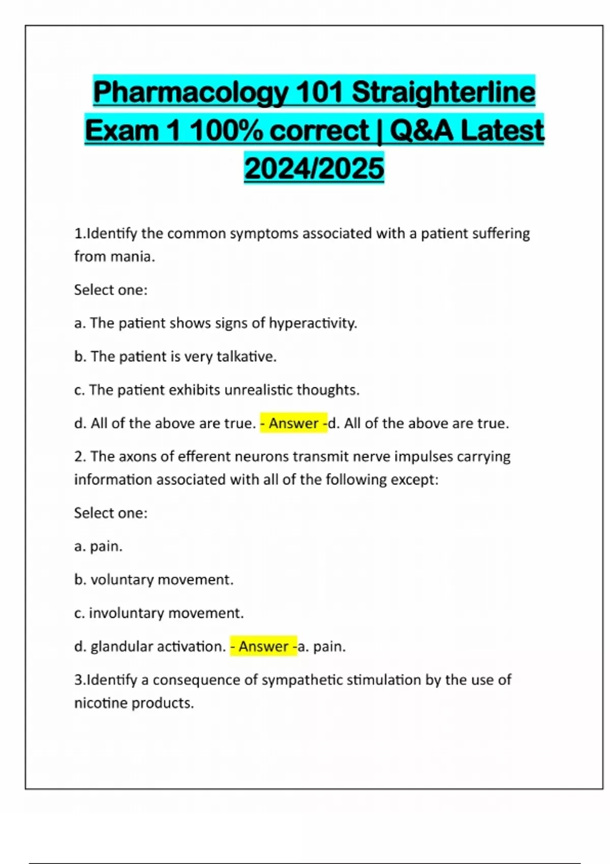 Pharmacology 101 Straighterline Exam 1 100% correct | Q&A Latest 2024/2025 1.Identify the common symptoms associated with a patient suffering from mania. Select one: a. The patient shows signs of hyperactivity. b. The patient is very talkative. c. The patient exhibits unrealistic thoughts. d. All of the above are true. - Answer -d. All of the above are true. 2. The axons of efferent neurons transmit nerve impulses carrying information associated with all of the following except: Select one: a. pain. b. voluntary movement. c. involuntary movement. d. glandular activation. - Answer -a. pain. 3.Identify a consequence of sympathetic stimulation by the use of nicotine products.Select one: a. Heart rate will increase