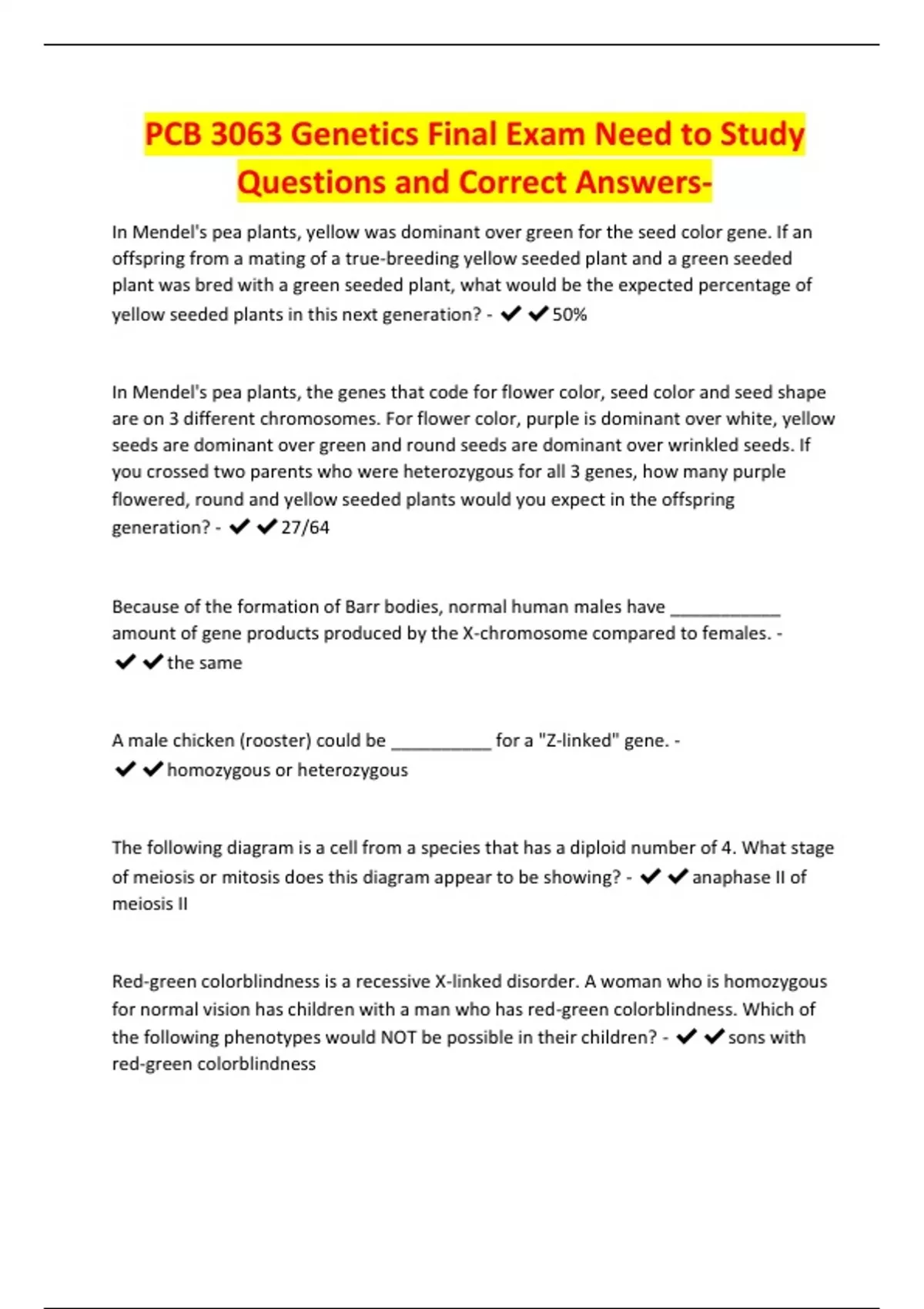 PCB 3063 Genetics Final Exam Need to Study Questions and Correct Answers