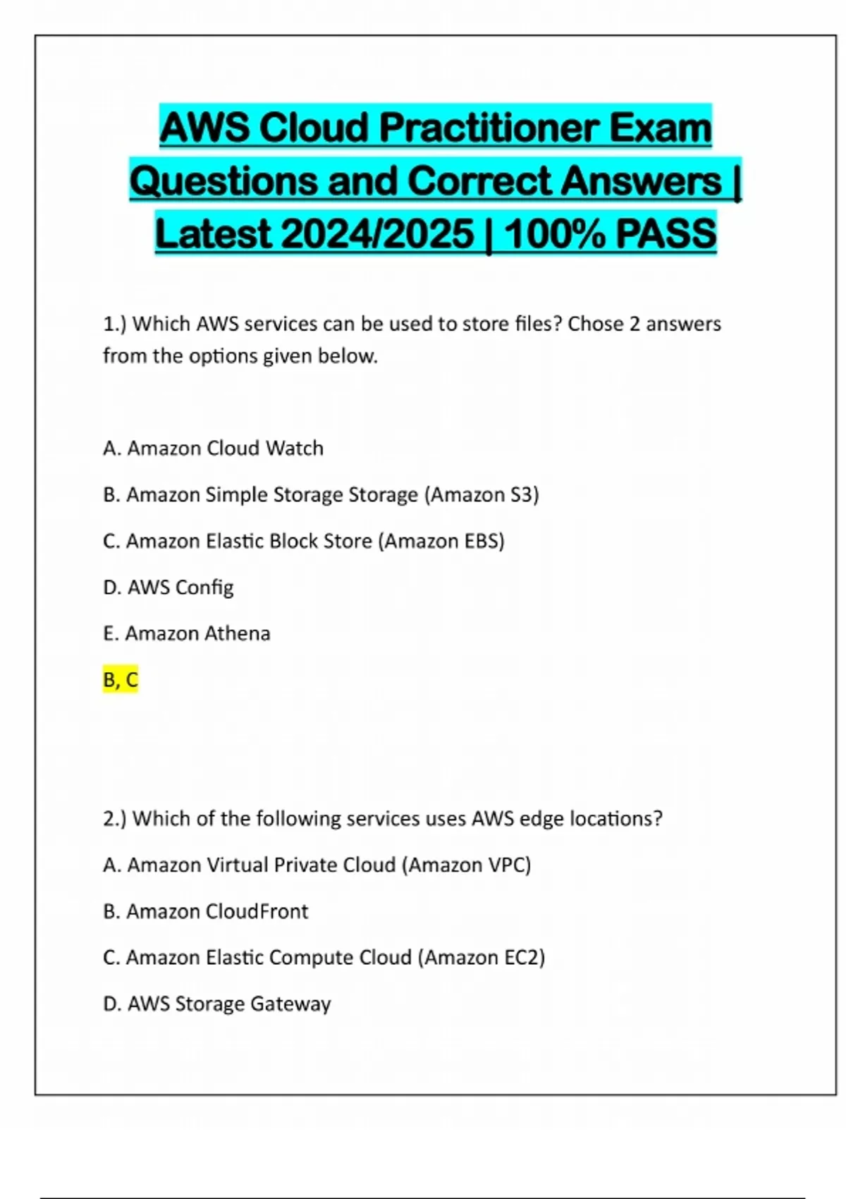AWS Cloud Practitioner Exam Questions and Correct Answers | Latest 2024/2025 | 100% PASS 1.) Which AWS services can be used to store files? Chose 2 answers from the options given below. A. Amazon Cloud Watch B. Amazon Simple Storage Storage (Amazon S3) C. Amazon Elastic Block Store (Amazon EBS) D. AWS Config E. Amazon Athena B, C 2.) Which of the following services uses AWS edge locations? A. Amazon Virtual Private Cloud (Amazon VPC) B. Amazon CloudFront C. Amazon Elastic Compute Cloud (Amazon EC2) D. AWS Storage GatewayB 3.) Which of the following is a benefit of Amazon Elastic Compute Cloud (Amazon EC2) over physical servers? A. Automated backup B. Paying only for what