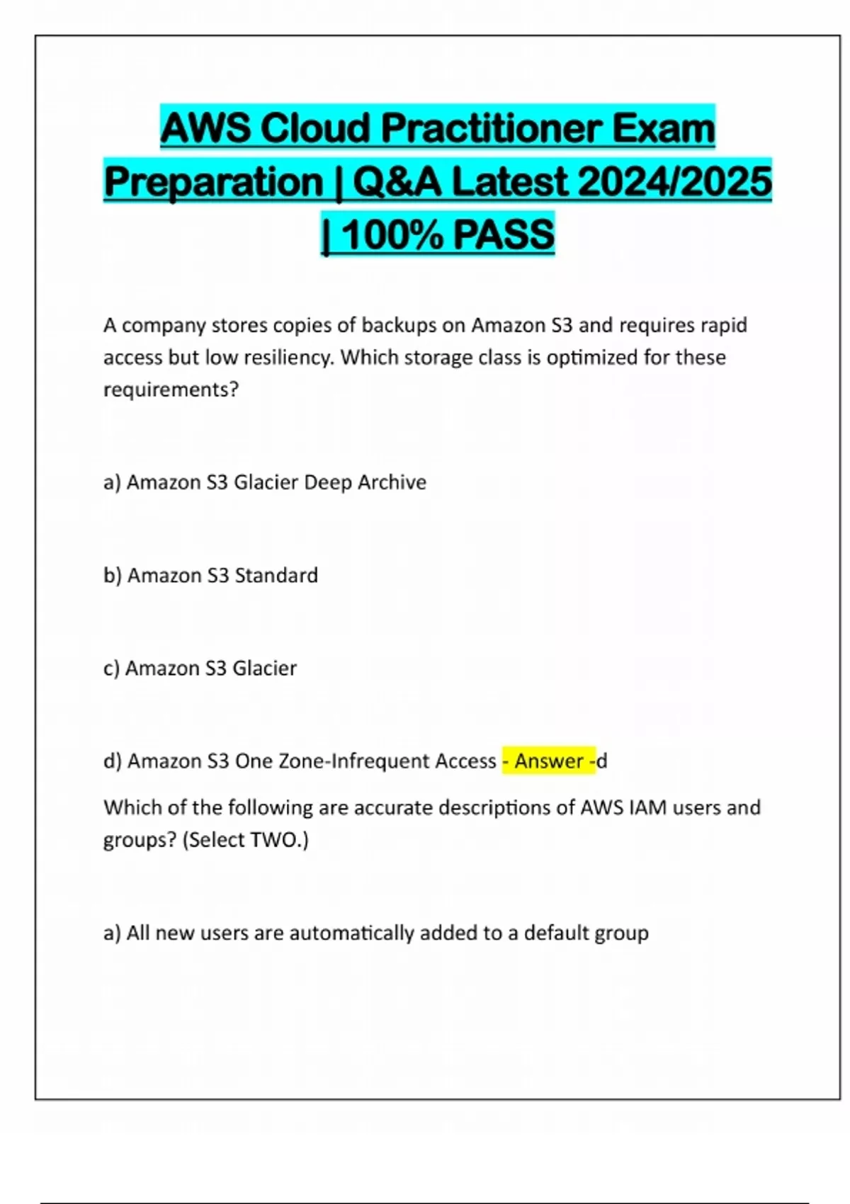 AWS Cloud Practitioner Exam Preparation | Q&A Latest 2024/2025 | 100% PASS A company stores copies of backups on Amazon S3 and requires rapid access but low resiliency. Which storage class is optimized for these requirements? a) Amazon S3 Glacier Deep Archive b) Amazon S3 Standard c) Amazon S3 Glacier d) Amazon S3 One Zone-Infrequent Access - Answer -d Which of the following are accurate descriptions of AWS IAM users and groups? (Select TWO.) a) All new users are automatically added to a default groupb) A user can be a member of multiple groups c) A user can only be a member of a single group at one a time d) Groups can contain users only and cannot be nested e) Groups can be nested and can contain other groups - Answer -b an
