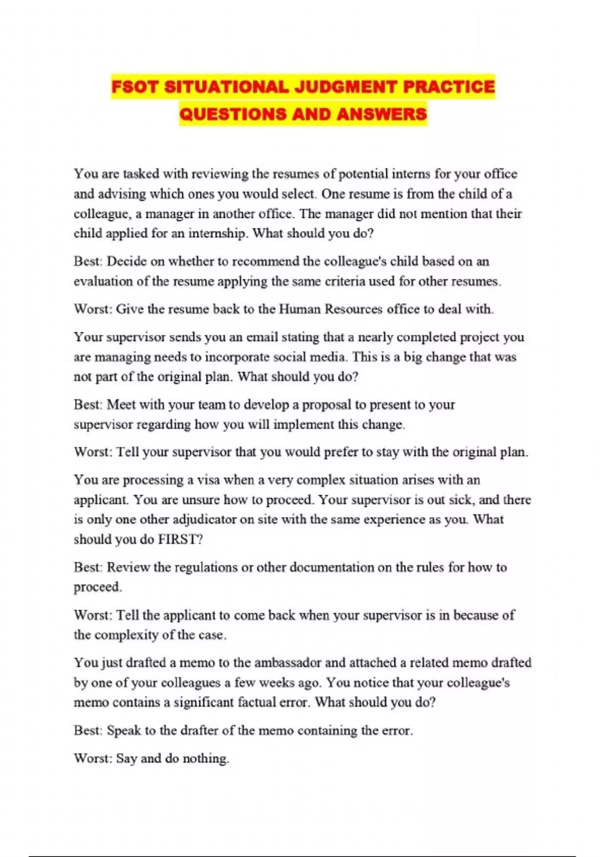 FSOT SITUATIONAL JUDGMENT PRACTICE QUESTIONS AND ANSWERS...