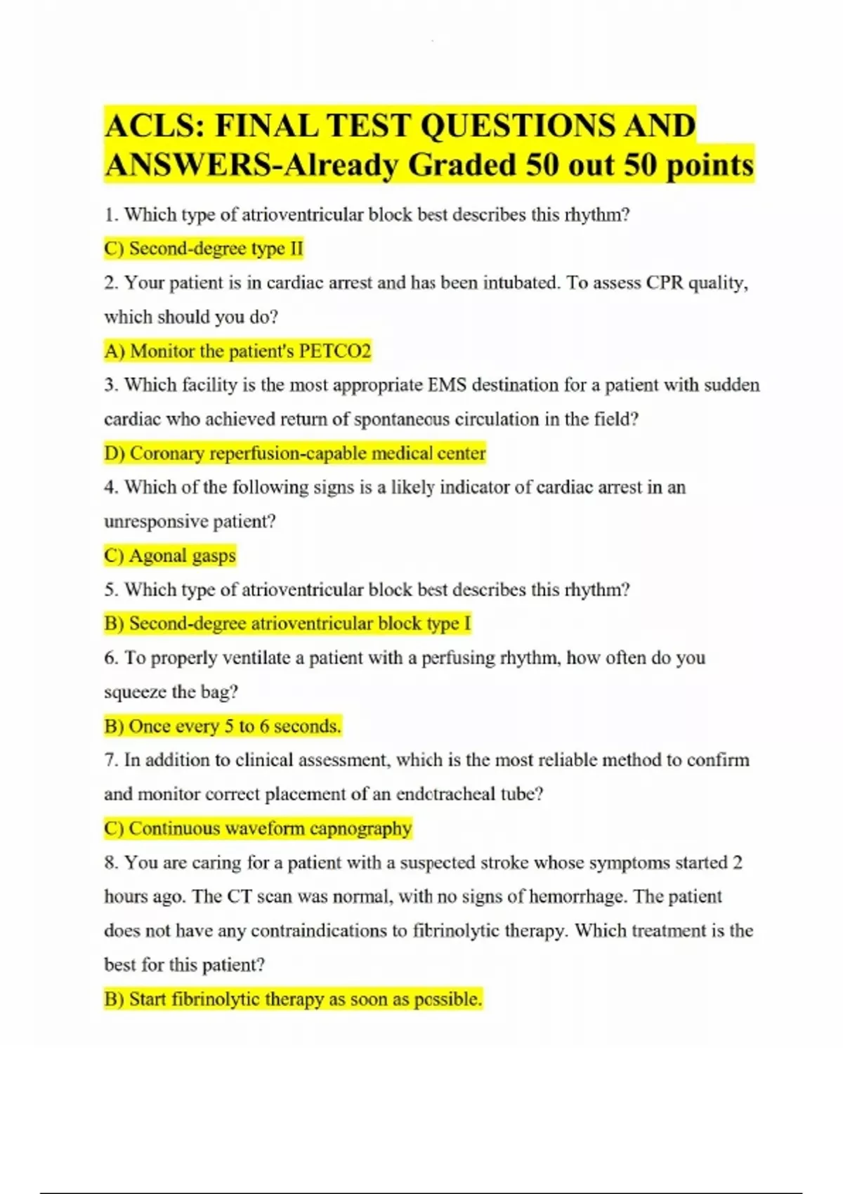 ACLS: FINAL TEST QUESTIONS AND ANSWERS-Already Graded 50 out 50 points 1. Which type of atrioventricular block best describes this rhythm? C) Second-degree type II 2. Your patient is in cardiac arrest and has been intubated. To assess CPR quality, which should you do? A) Monitor the patient's PETCO2 3. Which facility is the most appropriate EMS destination for a patient with sudden cardiac who achieved return of spontaneous circulation in the field? D) Coronary reperfusion-capable medical center 4. Which of the following signs is a likely indicator of cardiac arrest in an unresponsive patient? C) Agonal gasps 5. Which type of atrioventricular block best describes this rhythm? B) Second-degree atrioventricular block type I