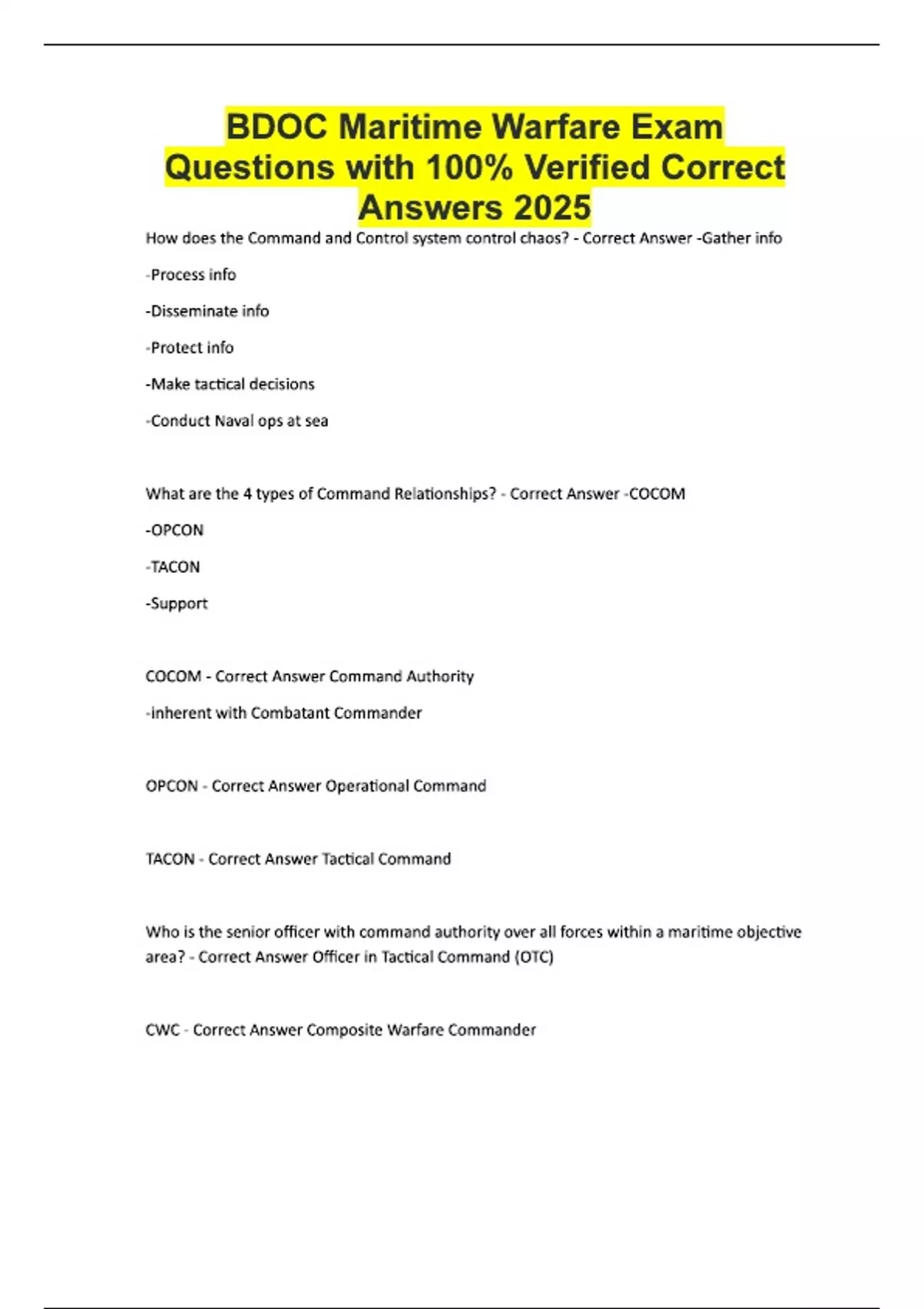 BDOC Maritime Warfare Exam Questions with 100% Verified Correct Answers 2025 How does the Command and Control system control chaos? - Correct Answer -Gather info -Process info -Disseminate info -Protect info -Make tactical decisions -Conduct Naval ops at sea What are the 4 types of Command Relationships? - Correct Answer -COCOM -OPCON -TACON -Support COCOM - Correct Answer Command Authority -inherent with Combatant Commander OPCON - Correct Answer Operational Command TACON - Correct Answer Tactical Command Who is the senior officer with command authority over all forces within a maritime objective area? - Correct Answer Officer in Tactical Command (OTC) CWC - Correct Answer Composite Warfare Commander Who does the CWC report to and what is that entity's battle group call sign? - Correct Answer -Officer in Tactical Command (OTC) -Primary: AA -Secondary: N/A Who reports to the Composite Warfare Commander (CWC) and what are their call signs? - Correct Answer -AMDC (P: W; S: C; white clouds) -IOWC (P: Q; S: E; question everything) -SCC (P: Z) —ASWC (P: X; S: Y) —SUWC (P: S; S: T) -STWC (P: P; S: K; punch kick) Who designates the first letter in a call sign? - Correct Answer The Strike Group (i.e., "EB" for ENTERPRISE Strike Group or "KB" for KEARSARGE Amphibious Ready Group) Who is established for extended periods of time and impacts all forces in CWC construct? - Correct Answer Warfare Commanders Who is more limited in scope and duration than Warfare Commanders and impact only a segmen
