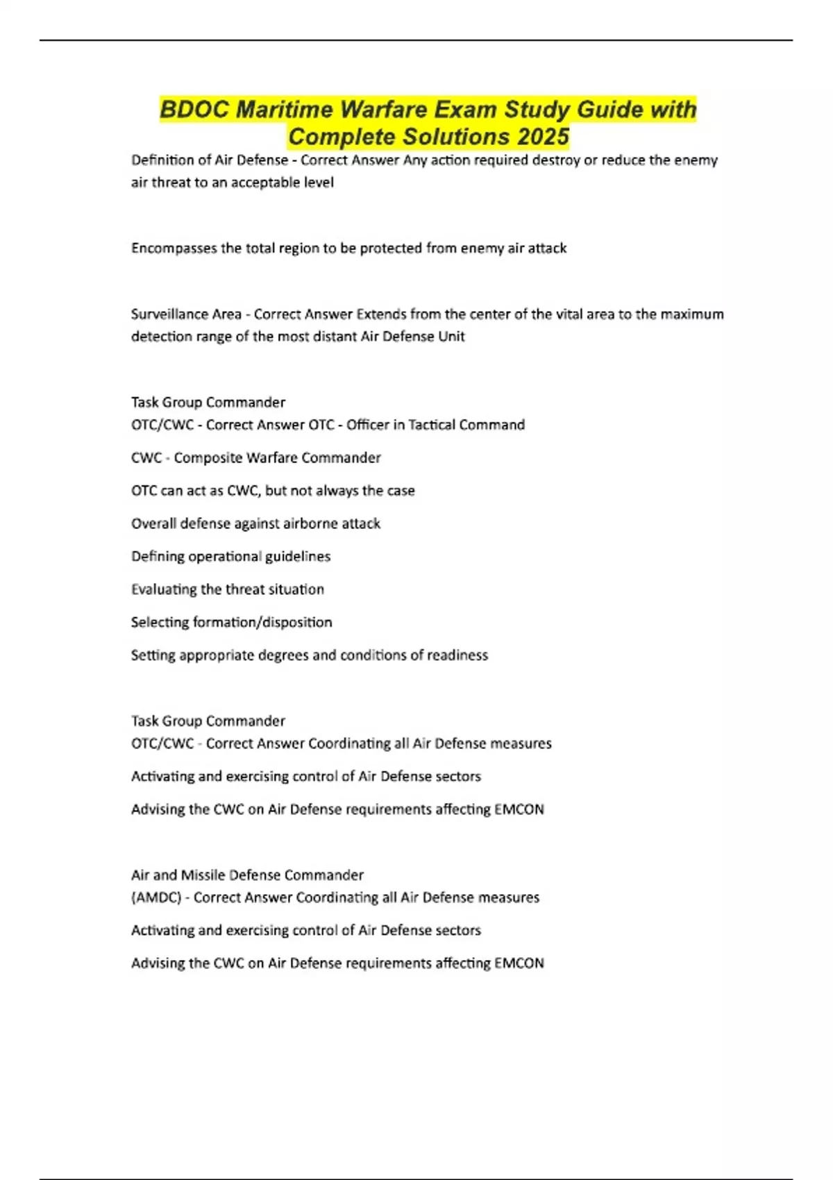 BDOC Maritime Warfare Exam Study Guide with Complete Solutions 2025 Definition of Air Defense - Correct Answer Any action required destroy or reduce the enemy air threat to an acceptable level Encompasses the total region to be protected from enemy air attack Surveillance Area - Correct Answer Extends from the center of the vital area to the maximum detection range of the most distant Air Defense Unit Task Group Commander OTC/CWC - Correct Answer OTC - Officer in Tactical Command CWC - Composite Warfare Commander OTC can act as CWC, but not always the case Overall defense against airborne attack Defining operational guidelines Evaluating the threat situation Selecting formation/disposition Setting appropriate degrees and conditions of readiness Task Group Commander OTC/CWC - Correct Answer Coordinating all Air Defense measures Activating and exercising control of Air Defense sectors Advising the CWC on Air Defense requirements affecting EMCON Air and Missile Defense Commander (AMDC) - Correct Answer Coordinating all Air Defense measures Activating and exercising control of Air Defense sectors Advising the CWC on Air Defense requirements affecting EMCON AMDC - Correct Answer Ensuring proper weapon designation and coordination Issuing air threat warnings Assigning Defense Counter-Air (DCA) and Airborne Early Warning (AEW) Aircraft
