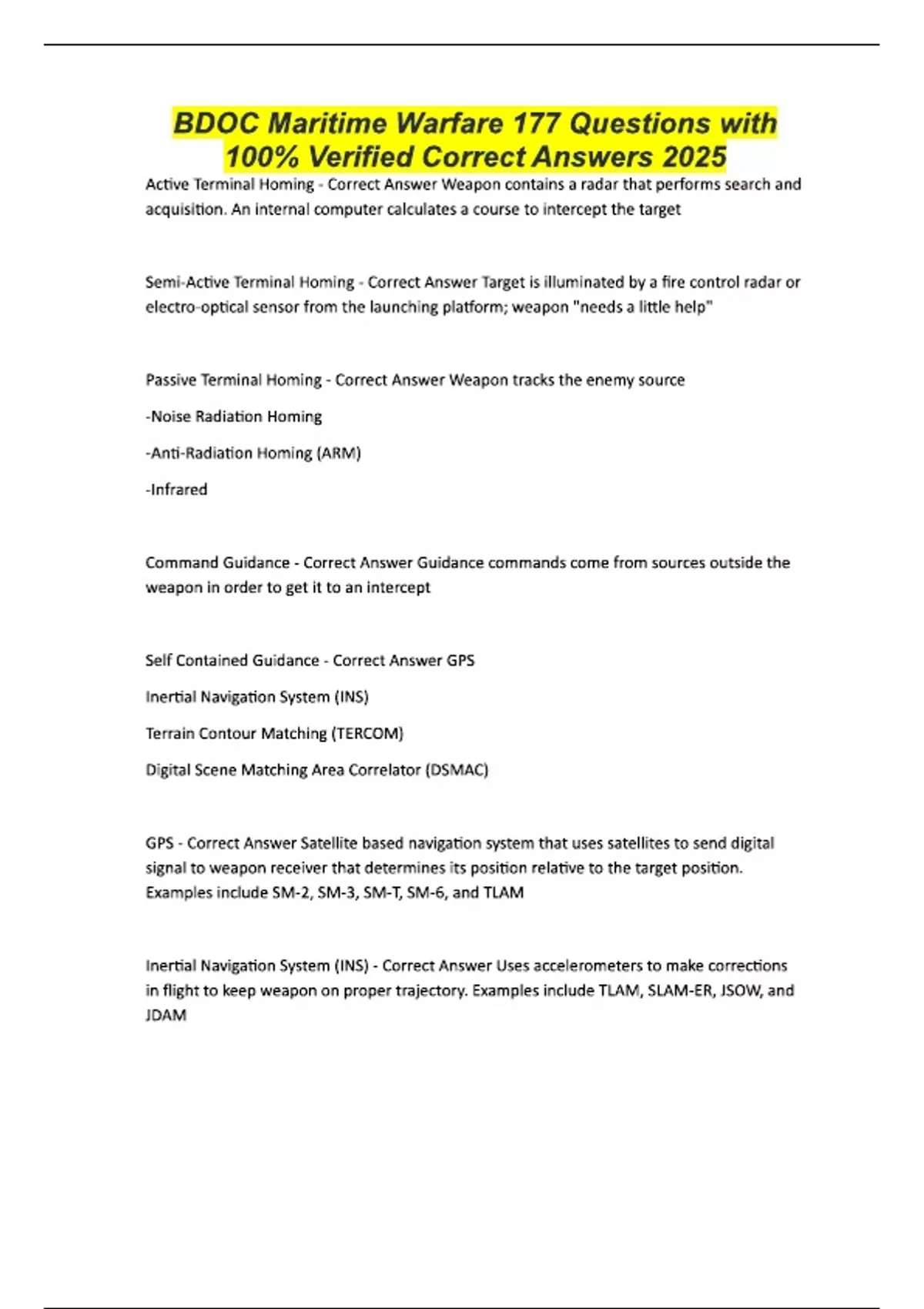 BDOC Maritime Warfare 177 Questions with 100% Verified Correct Answers 2025 Active Terminal Homing - Correct Answer Weapon contains a radar that performs search and acquisition. An internal computer calculates a course to intercept the target Semi-Active Terminal Homing - Correct Answer Target is illuminated by a fire control radar or electro-optical sensor from the launching platform; weapon "needs a little help" Passive Terminal Homing - Correct Answer Weapon tracks the enemy source -Noise Radiation Homing -Anti-Radiation Homing (ARM) -Infrared Command Guidance - Correct Answer Guidance commands come from sources outside the weapon in order to get it to an intercept Self Contained Guidance - Correct Answer GPS Inertial Navigation System (INS) Terrain Contour Matching (TERCOM) Digital Scene Matching Area Correlator (DSMAC) GPS - Correct Answer Satellite based navigation system that uses satellites to send digital signal to weapon receiver that determines its position relative to the target position. Examples include SM-2, SM-3, SM-T, SM-6, and TLAM Inertial Navigation System (INS) - Correct Answer Uses accelerometers to make corrections in flight to keep weapon on proper trajectory. Examples include TLAM, SLAM-ER, JSOW, and JDAM Terrain Contour Matching (TERCOM) - Correct Answer uses an altimeter and a database of stored 3D navigation "maps" that guide the missile en route to its target. Example includes TLAM