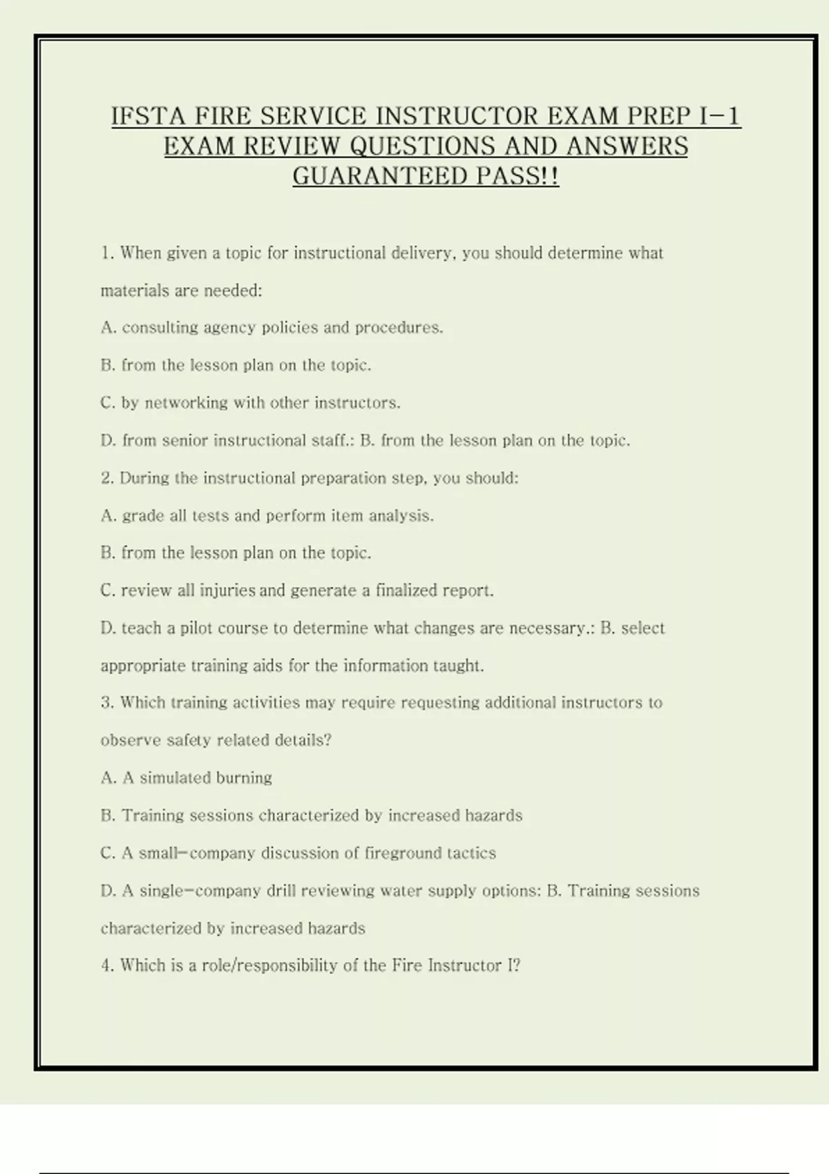 IFSTA FIRE SERVICE INSTRUCTOR EXAM PREP I-1 EXAM REVIEW QUESTIONS AND ANSWERS GUARANTEED PASS!! 1. When given a topic for instructional delivery, you should determine what materials are needed: A. consulting agency policies and procedures. B. from the lesson plan on the topic. C. by networking with other instructors. D. from senior instructional staff.: B. from the lesson plan on the topic. 2. During the instructional preparation step, you should: A. grade all tests and perform item analysis. B. from the lesson plan on the topic. C. review all injuries and generate a finalized report. D. teach a pilot course to determine what changes are necessary.: B. select appropriate training aids for the information taught. 3. Which training activities may require requesting additional instructors to observe safety related details? A. A simulated burning B. Training sessions characterized by increased hazards C. A small-company discussion of fireground tactics D. A single-company drill reviewing water supply options: B. Training sessions characterized by increased hazards 4. Which is a role/responsibility of the Fire Instructor I?