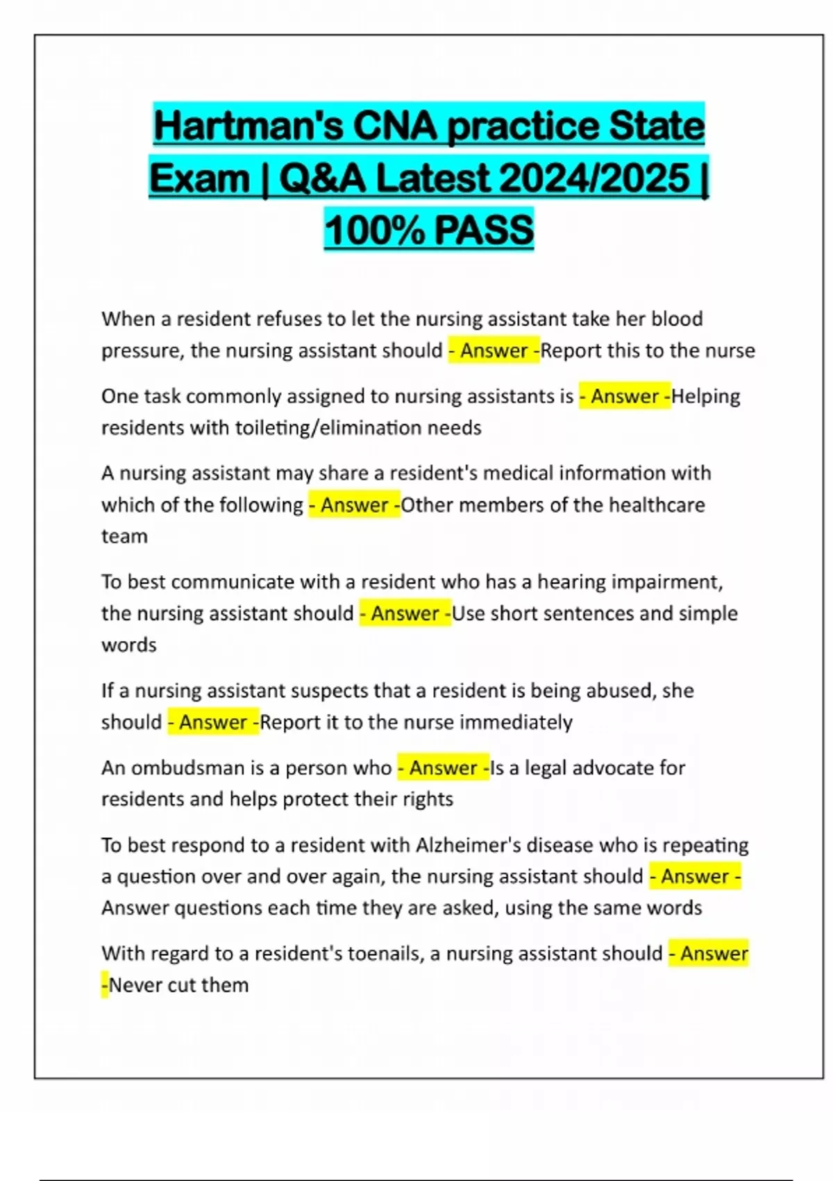 Hartman's CNA practice State Exam | Q&A Latest 2024/2025 | 100% PASS