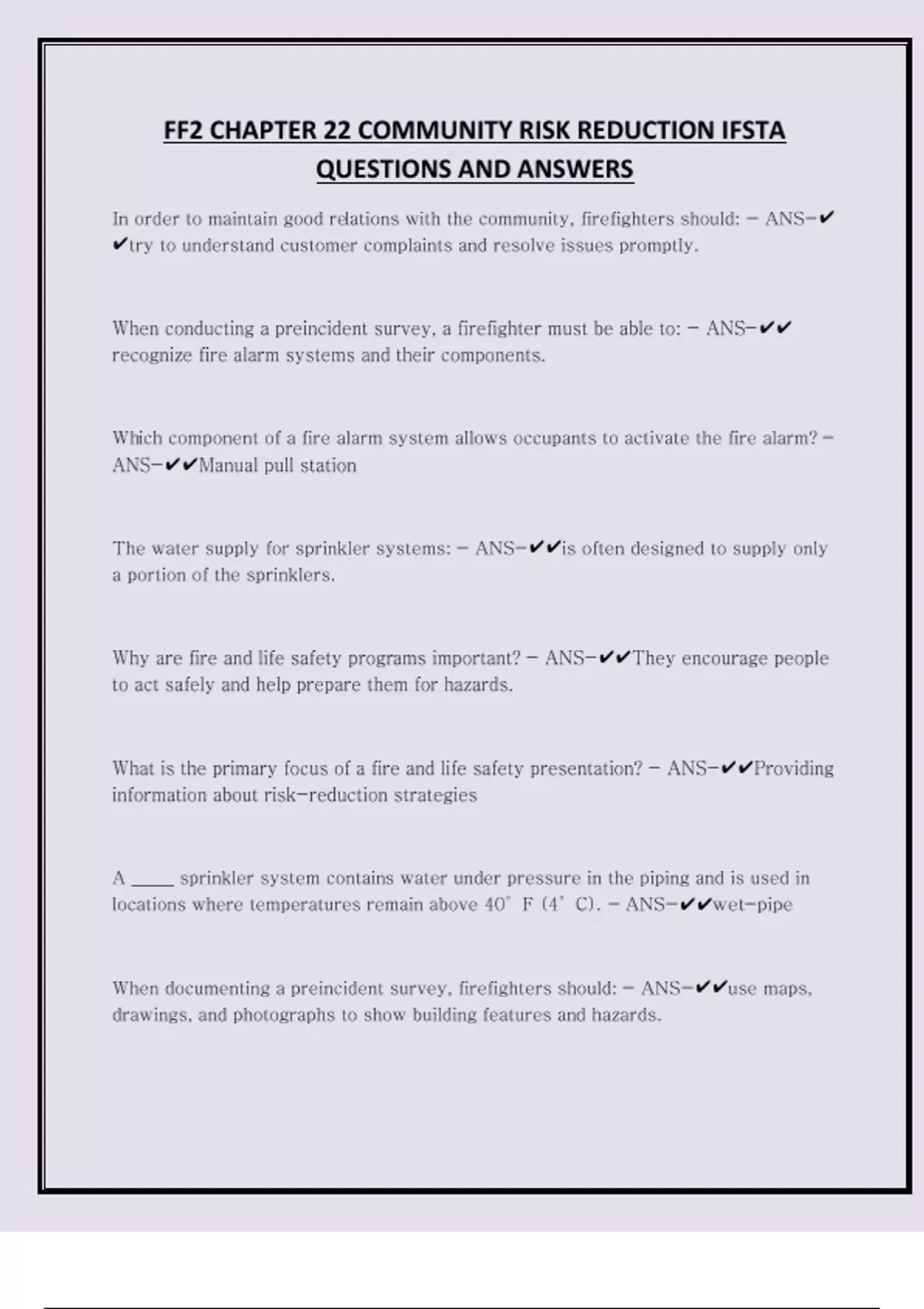 FF2 CHAPTER 22 COMMUNITY RISK REDUCTION IFSTA QUESTIONS AND ANSWERS In order to maintain good relations with the community, firefighters should: - ANS-try to understand customer complaints and resolve issues promptly. When conducting a preincident survey, a firefighter must be able to: - ANS-recognize fire alarm systems and their components. Which component of a fire alarm system allows occupants to activate the fire alarm? - ANS-Manual pull station The water supply for sprinkler systems: - ANS-is often designed to supply only a portion of the sprinklers. Why are fire and life safety programs important? - ANS-They encourage people to act safely and help prepare them for hazards. What is the primary focus of a fire and life safety presentation? - ANS-