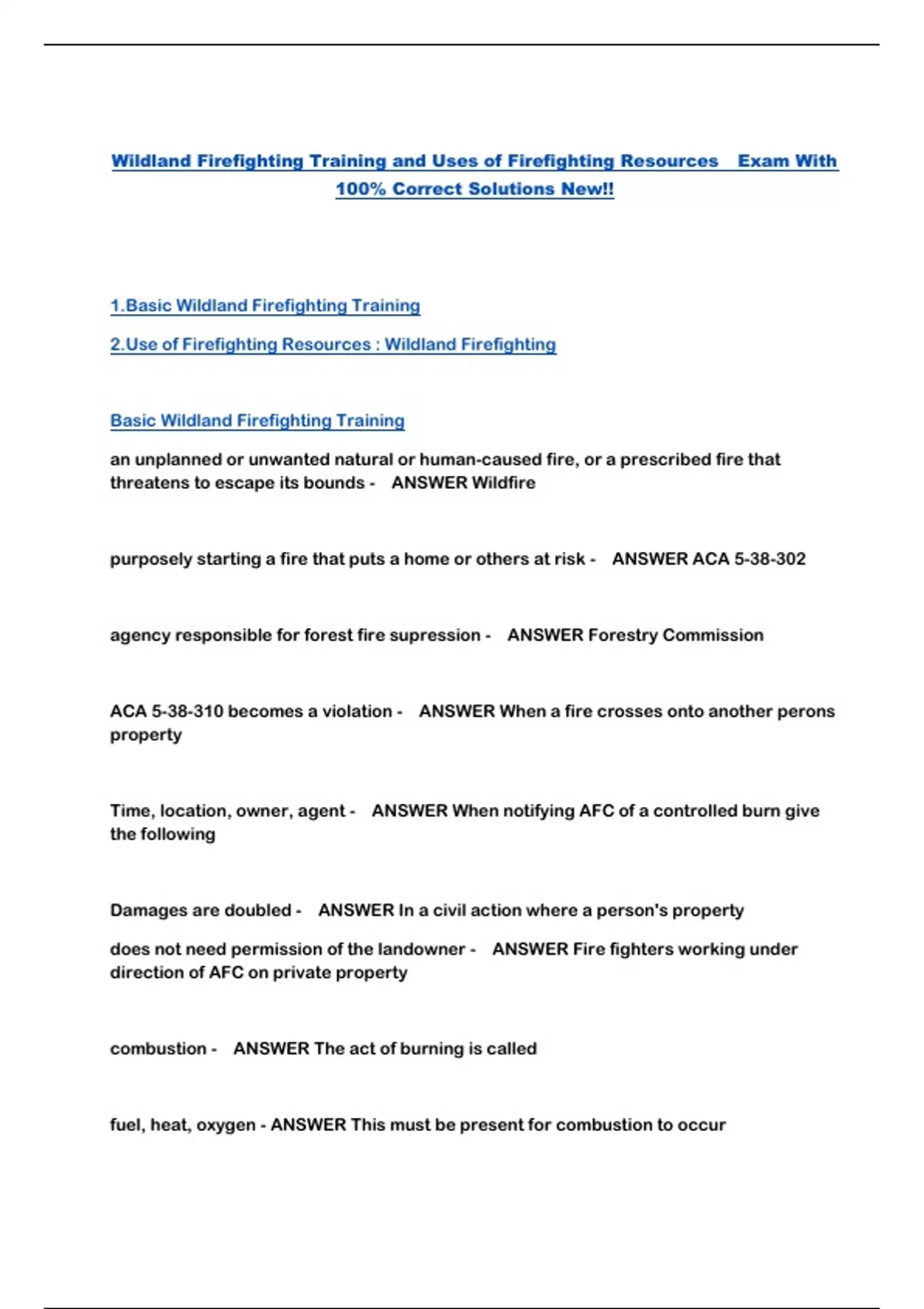 Wildland Firefighting Training and Uses of Firefighting Resources Exam With