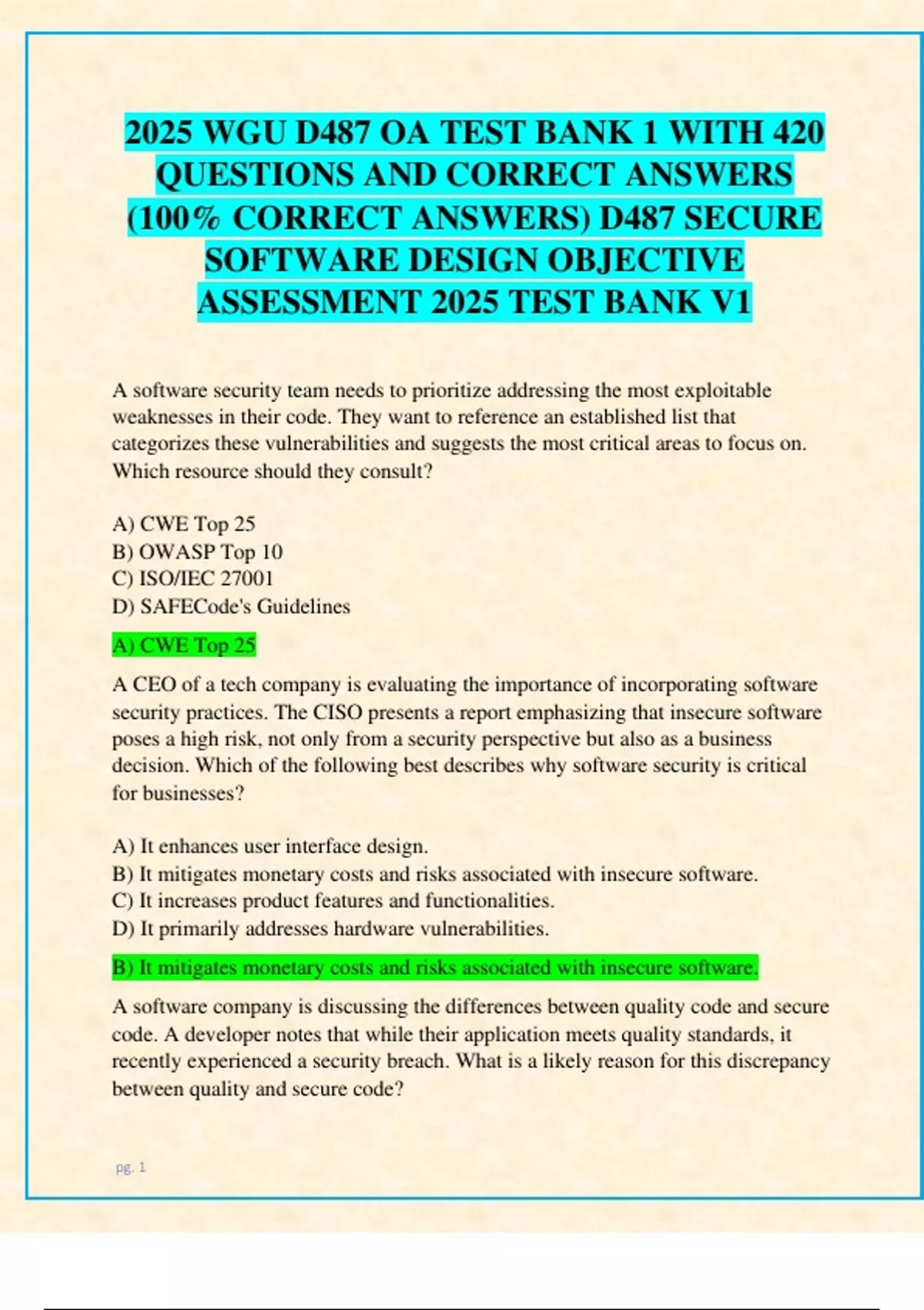 2025 WGU D487 OA TEST BANK 1 WITH 420 QUESTIONS AND CORRECT ANSWERS (100% CORRECT ANSWERS) D487 SECURE SOFTWARE DESIGN OBJECTIVE ASSESSMENT 2025 TEST BANK V1