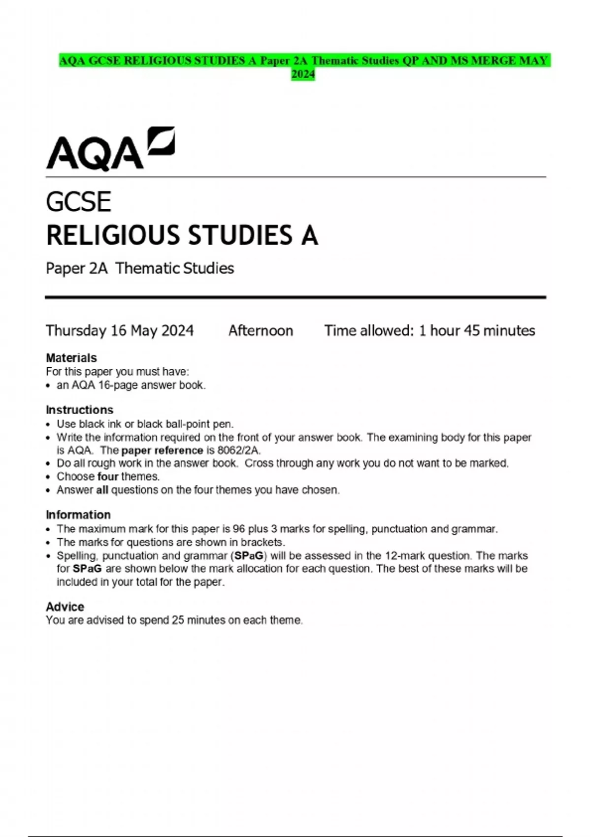 AQA GCSE RELIGIOUS STUDIES A Paper 2A Thematic Studies QP AND MS MERGE MAY 2024